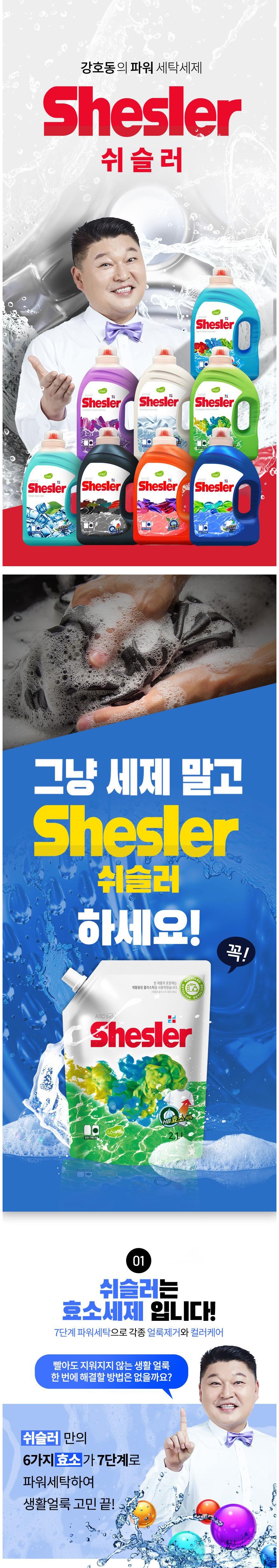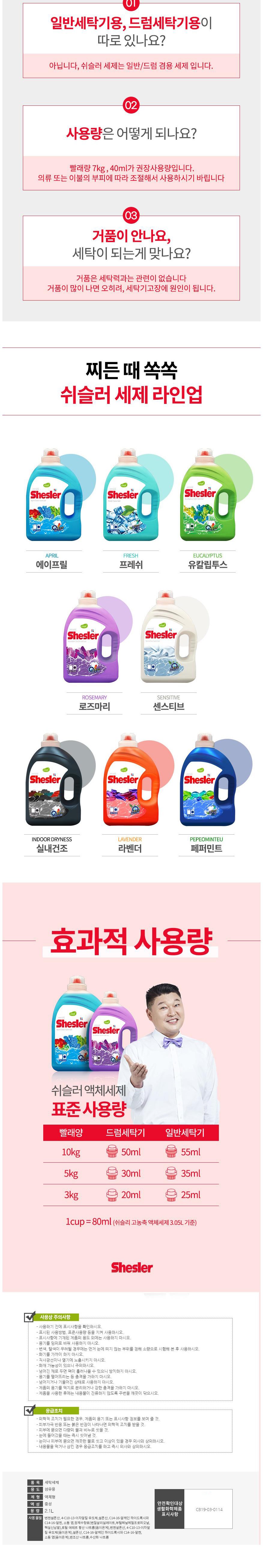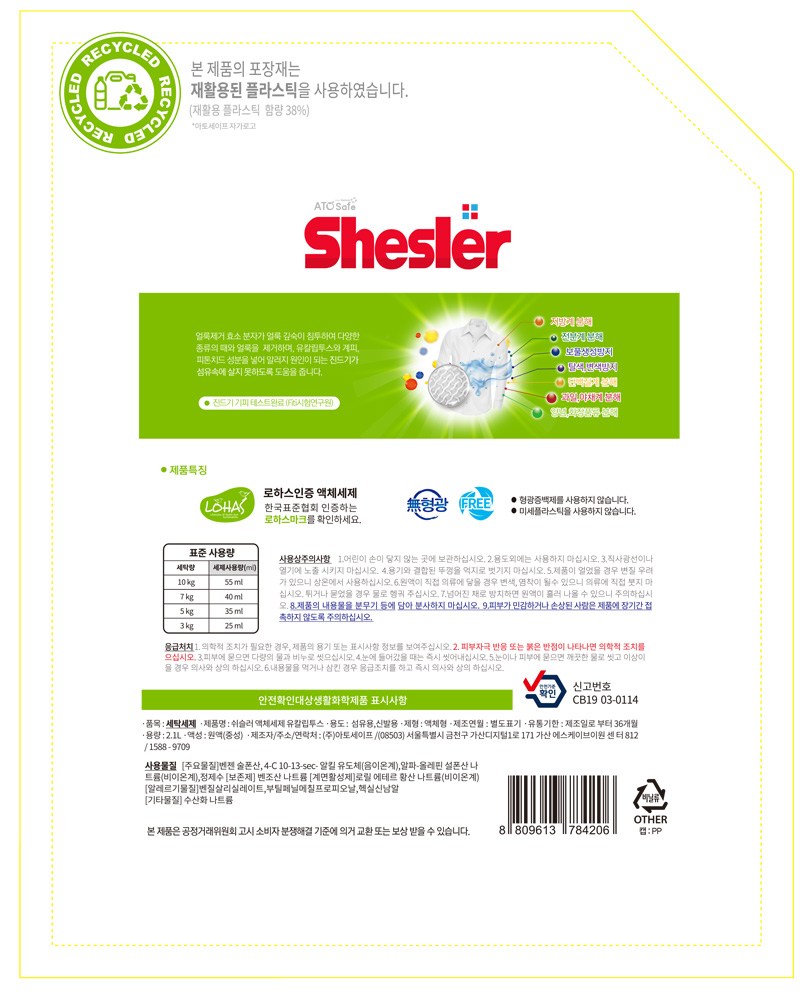 | 품목 및 제품명 | 세탁세제 / 쉬슬러 액체세제 유칼립투스 | 용도(표백제의 경우 계열을 함께표시) 및 제형 | 섬유용, 신발용 / 액체형 |