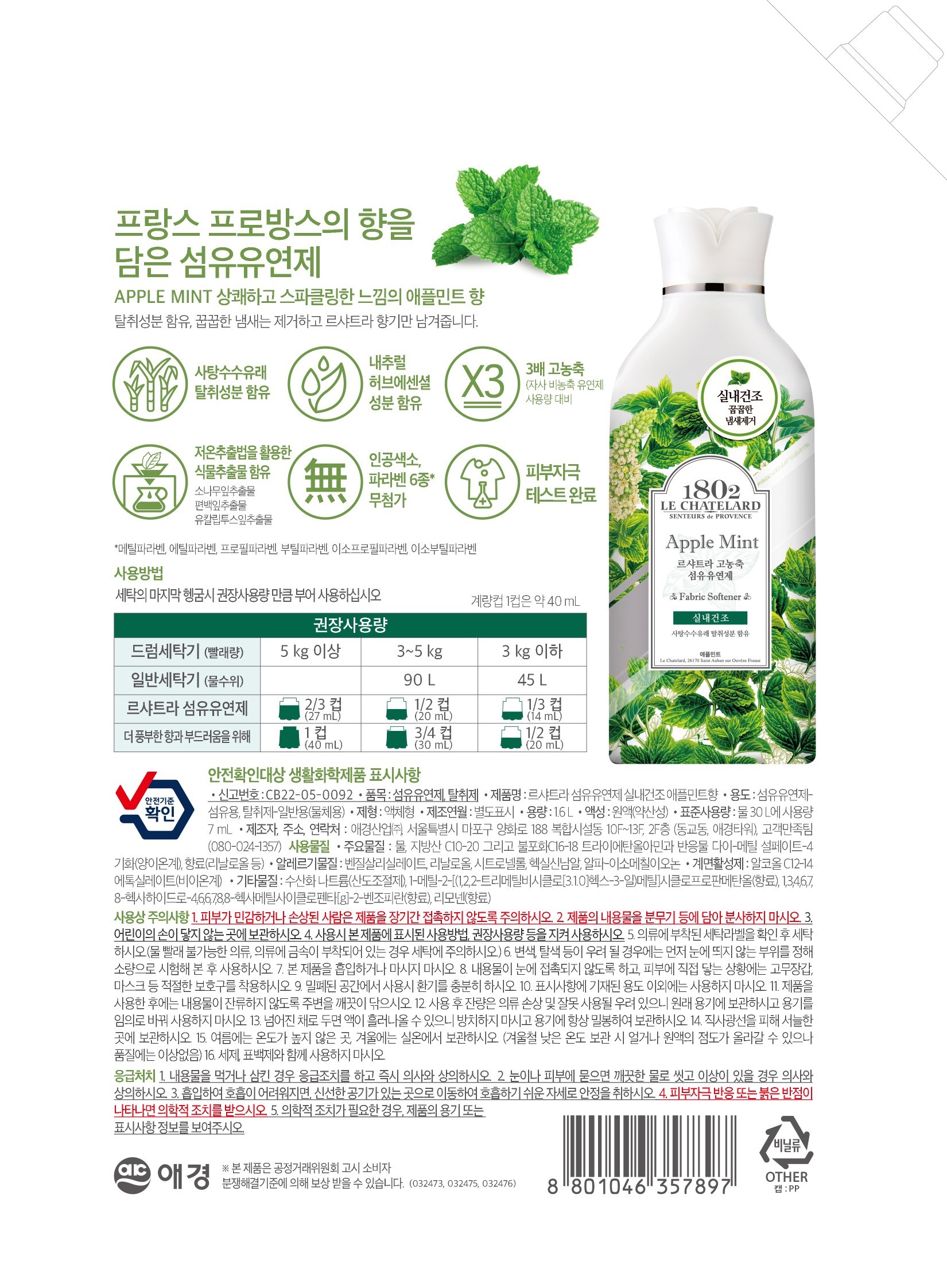 | 품목 및 제품명 | 섬유유연제, 탈취제 / 르샤트라 섬유유연제 실내건조 애플민트향 | 용도(표백제의 경우 계열을 함께표시) 및 제형 | 섬유유연제- 섬유용, 탈취제-일반용(물체용) / 액체형 |