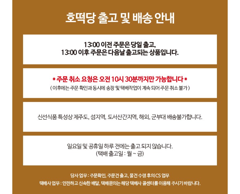 | 배송방법 | 신선/냉장/냉동 | 배송비 | 무료배송 - 도서산간 지역 배송불가 |