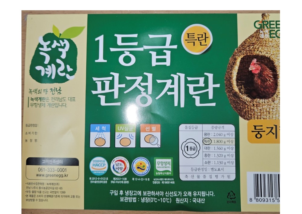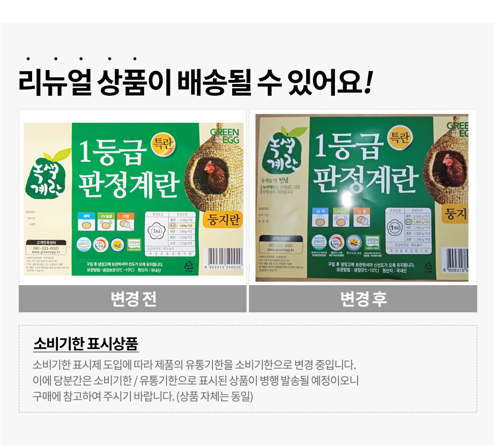 | 제조연월일, 소비기한 또는 품질유지기한 | 업데이트 예정 | 세부 품목군별 표시사항 | 축산물 등급표시: 1등급 / 이력번호 표시유무 - 난각번호 표시제품임 |