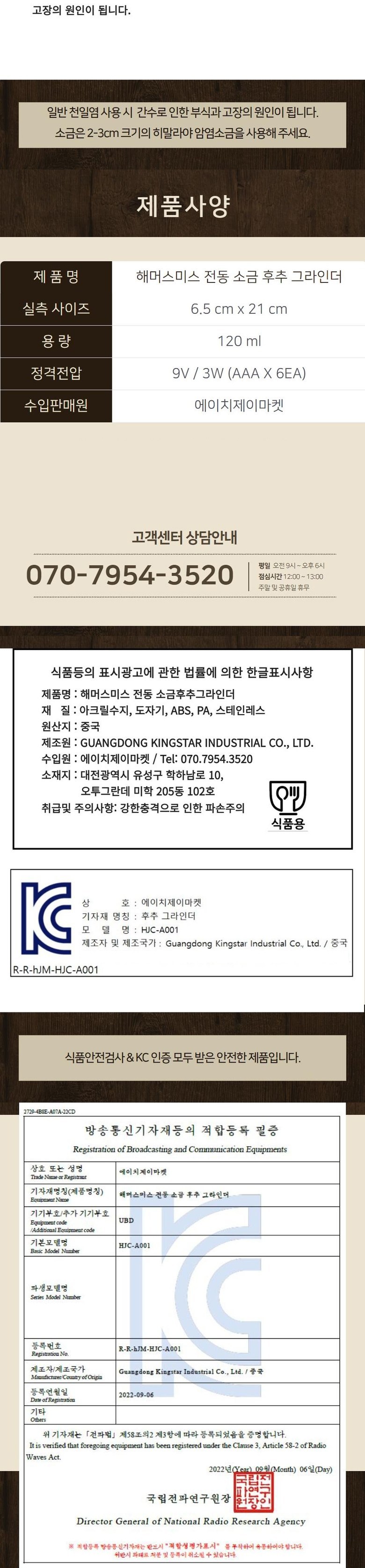 | 품명 및 모델명 | 해머스미스 후추 그라인더 전동 통후추 히말라야 소금 그라인더/ HJC-A001 | KC 인증정보 | R-R-hJM-HJC-A001 |