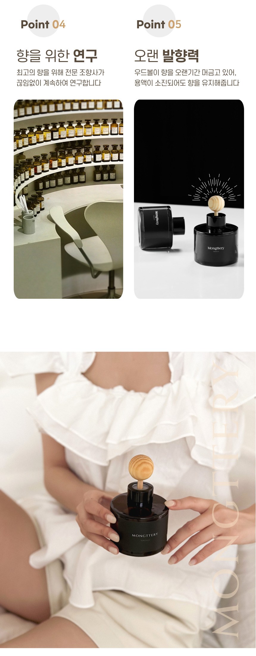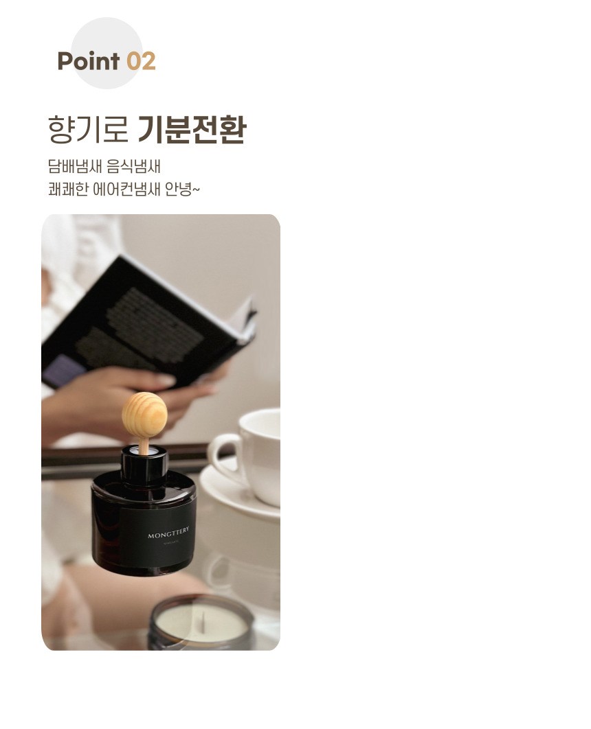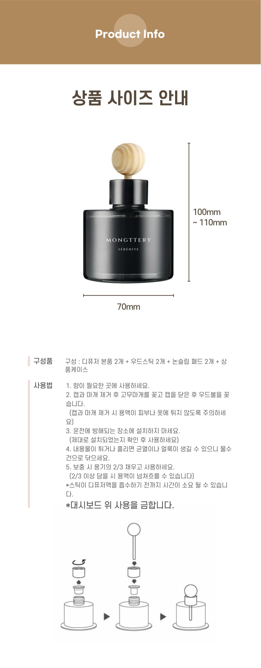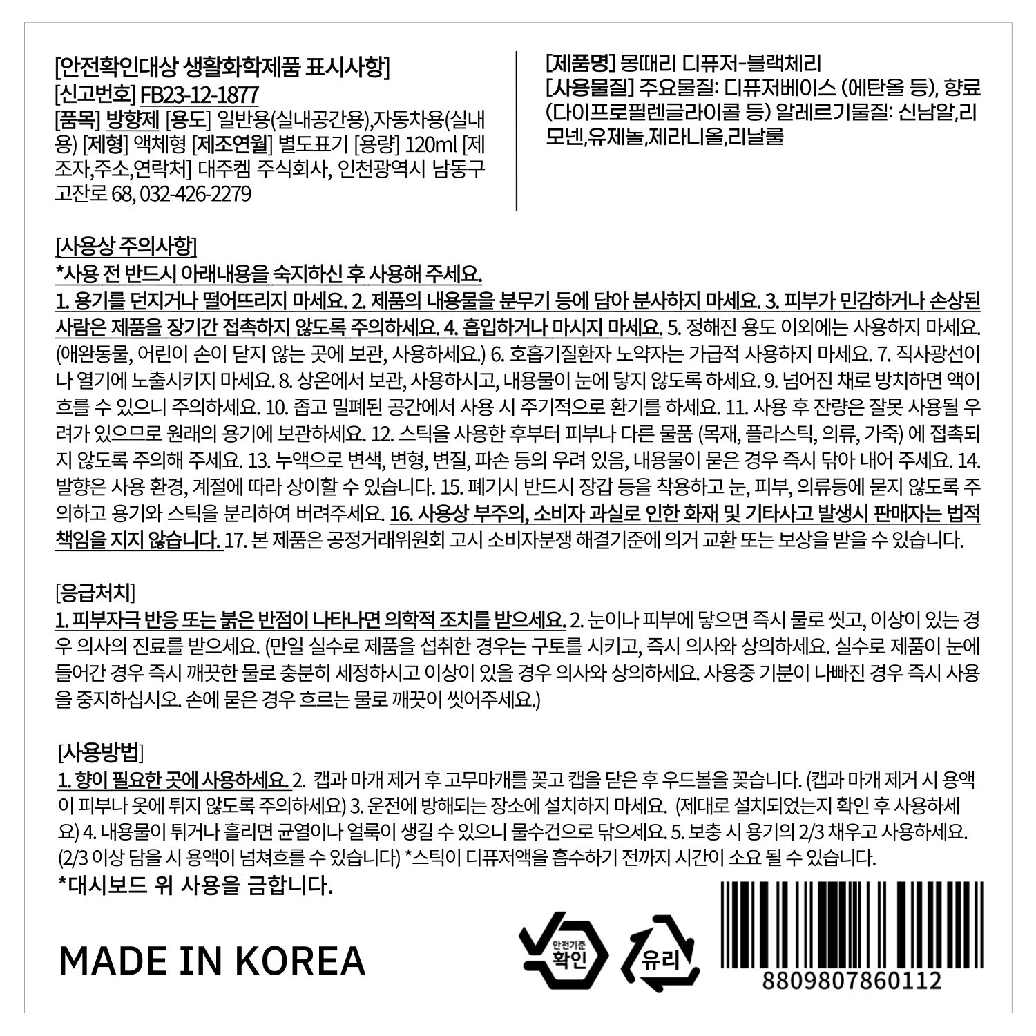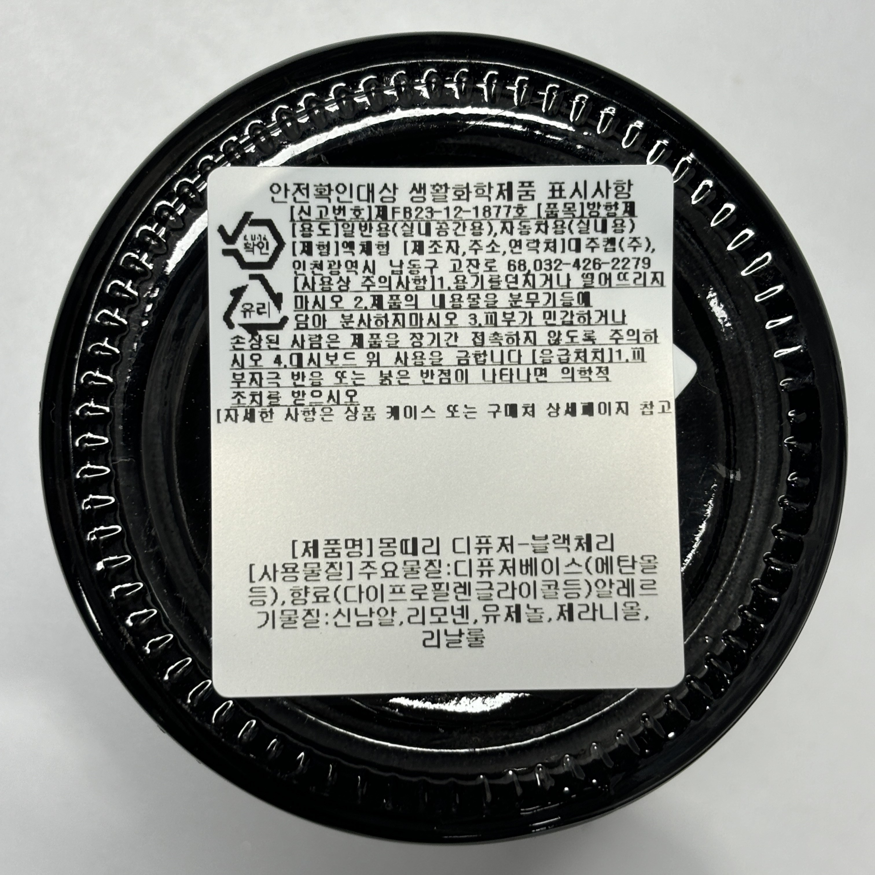 | 품목 및 제품명 | 방향제/몽때리 디퓨저-블랙체리 | 용도(표백제의 경우 계열을 함께표시) 및 제형 | 일반용(실내공간용),자동차용(실내용),/액체형 |