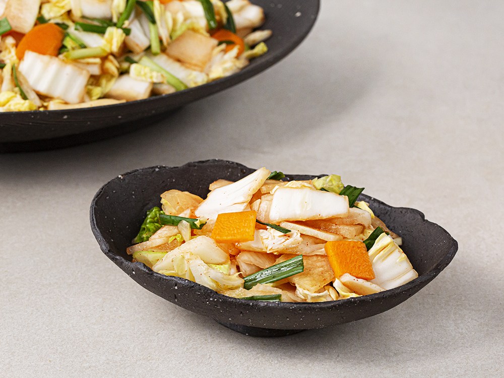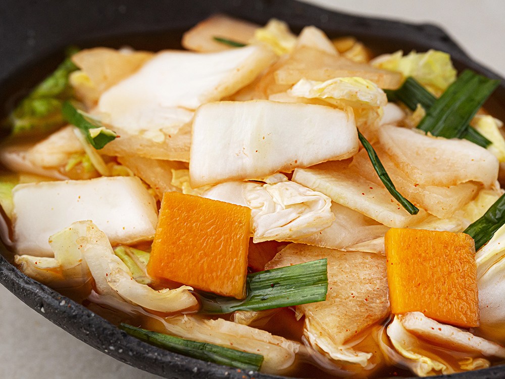 간편하게 식탁에 내기 좋은 나박김치예요. 각종 채소가 입에 쏙 넣기 좋은 크기로 썰려 있어 먹기 편하지요. 깔끔하고 칼칼한 풍미는 입맛을 사로잡는답니다. 그대로 반찬으로 드셔도 좋고, 국수나 냉면의 육수로 활용해도 좋아요.
