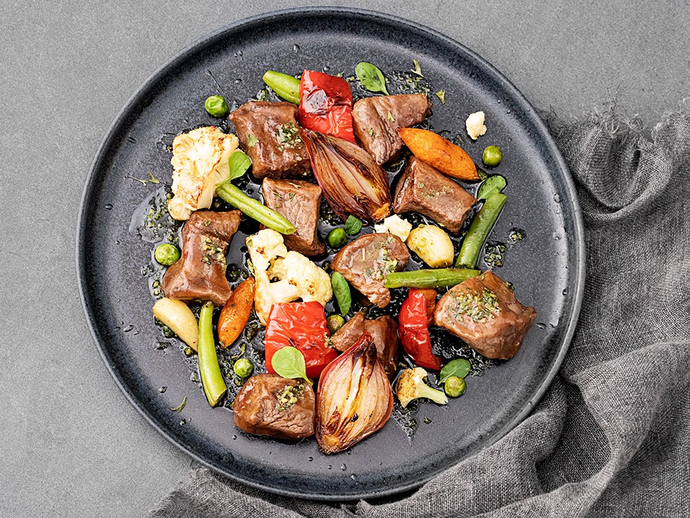 재료: 양고기 큐브 250g, 스테이크 소스 30g, 샬롯 1개, 파프리카 1/4개, 당근 1/4개, 그린빈 4개, 컬리플라워 20g, 마늘 5쪽, 어린잎 10g, 완두콩 5g, 소금, 후추, 버터, 파슬리가루