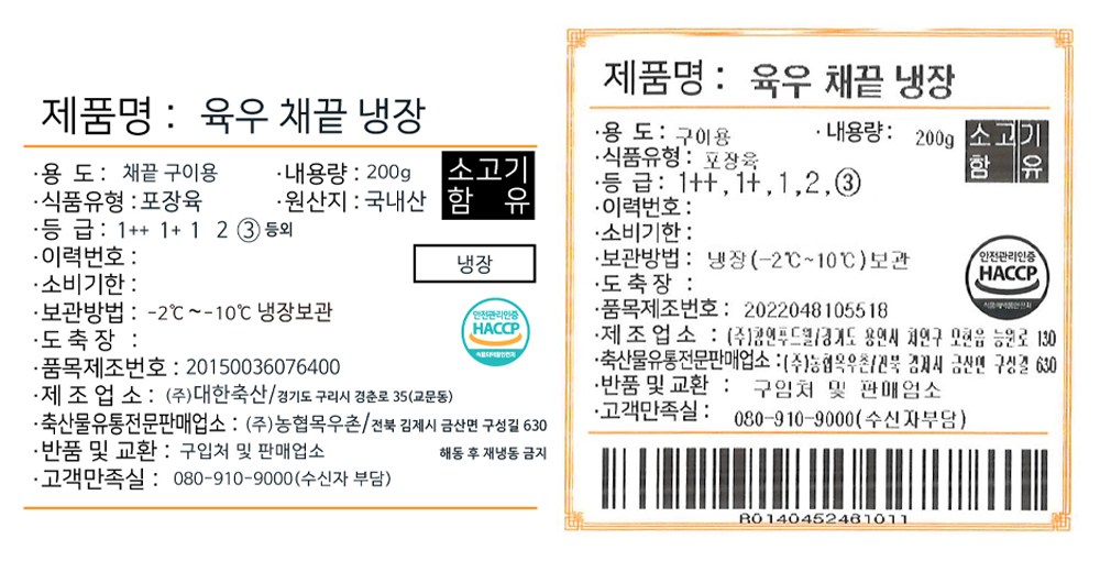 | 제조연월일, 소비기한 또는 품질유지기한 | 소비기한(또는 유통기한) : 2026년 05월 01일 이거나 그 이후인 상품 제조년월일 : 2026년 04월 20일 이후인 제조상품 | 세부 품목군별 표시사항 | 축산물 등급표시 : 3등급 / 이력번호 표시유무 : 이력번호 표시제품임 |