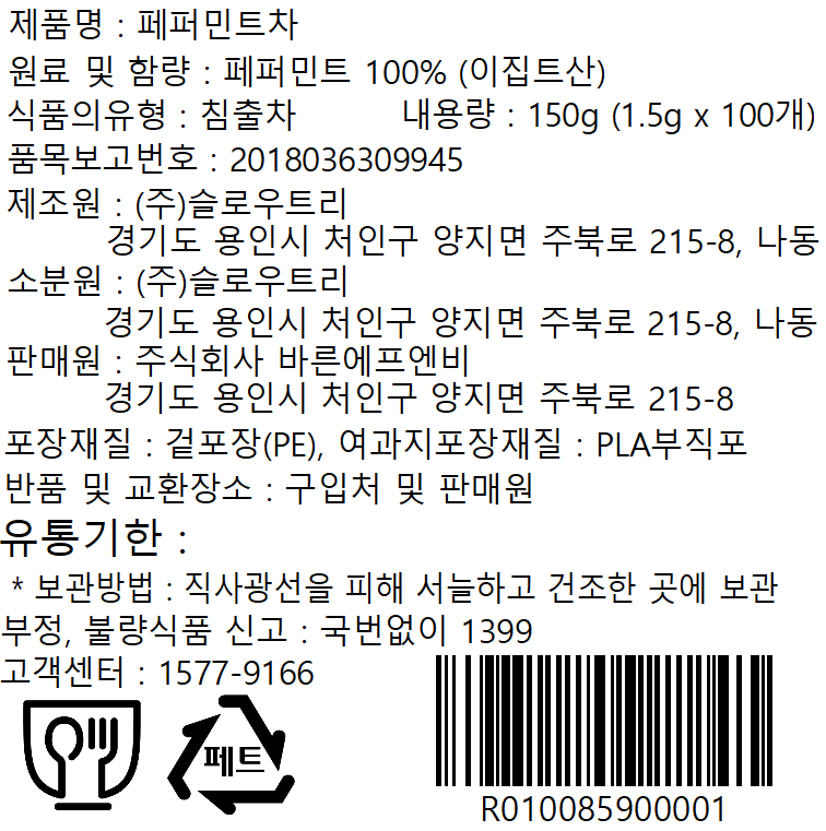 | 제품명 | 페퍼민트 차 | 식품의 유형 | 컨텐츠 참조 |
