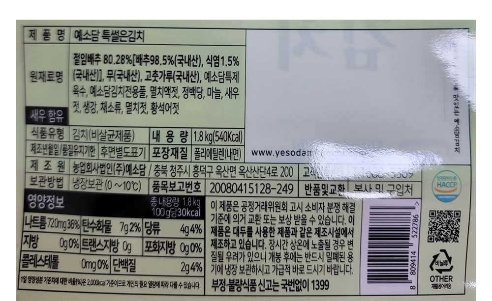 | 포장단위별 내용물의 용량(중량), 수량 | 1.8kg , 2개 | 원재료명 및 함량 | 컨텐츠 참조 |