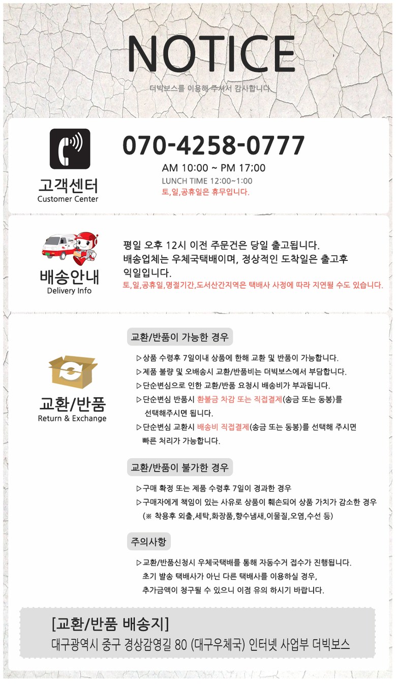 - ㆍ교환/반품에 관한 일반적인 사항은 판매자가 제시사항보다 관계법령이 우선합니다.
