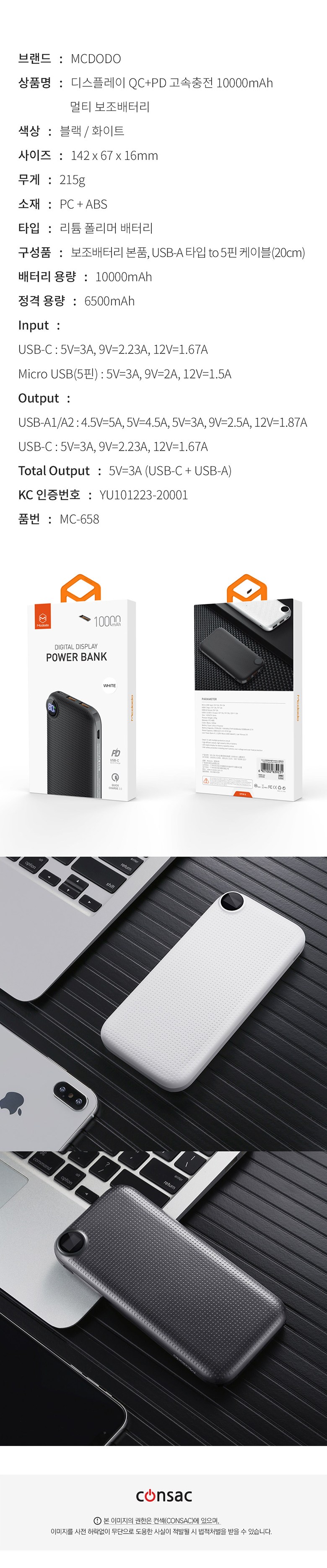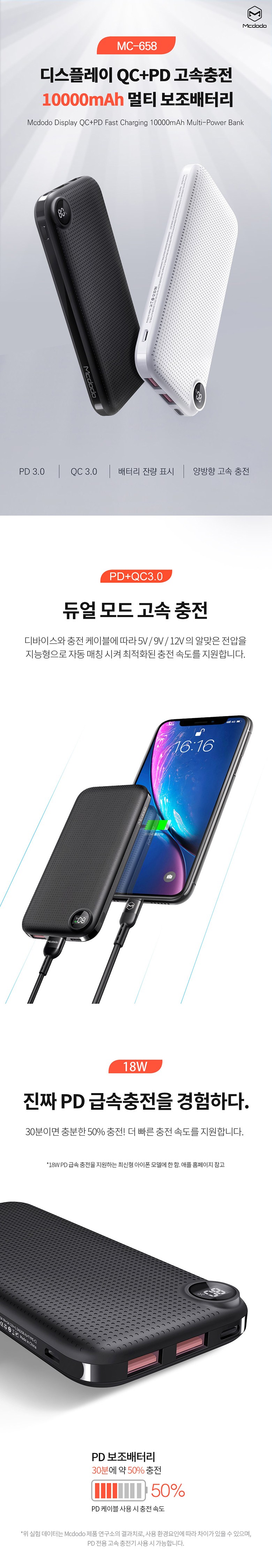 | 품명 및 모델명 | 디스플레이 QC 플러스 PD 고속충전 멀티 보조배터리 10000mAh + C타입 to C타입 PD 고속충전 케이블 / MC-658 | KC 인증정보 | YU101223-20001 |