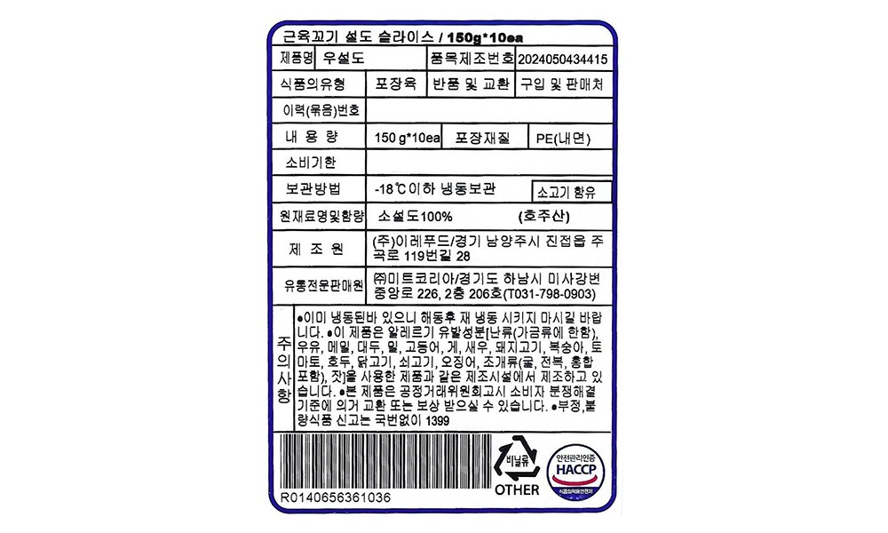 | 제조연월일, 소비기한 또는 품질유지기한 | 소비기한(또는 유통기한) : 2027년 03월 19일 이거나 그 이후인 상품 제조년월일 : 2026년 03월 20일 이후인 제조상품 | 세부 품목군별 표시사항 | 축산물 등급표시: 해당없음 / 이력번호 표시유무 - 이력번호 표시제품임 |