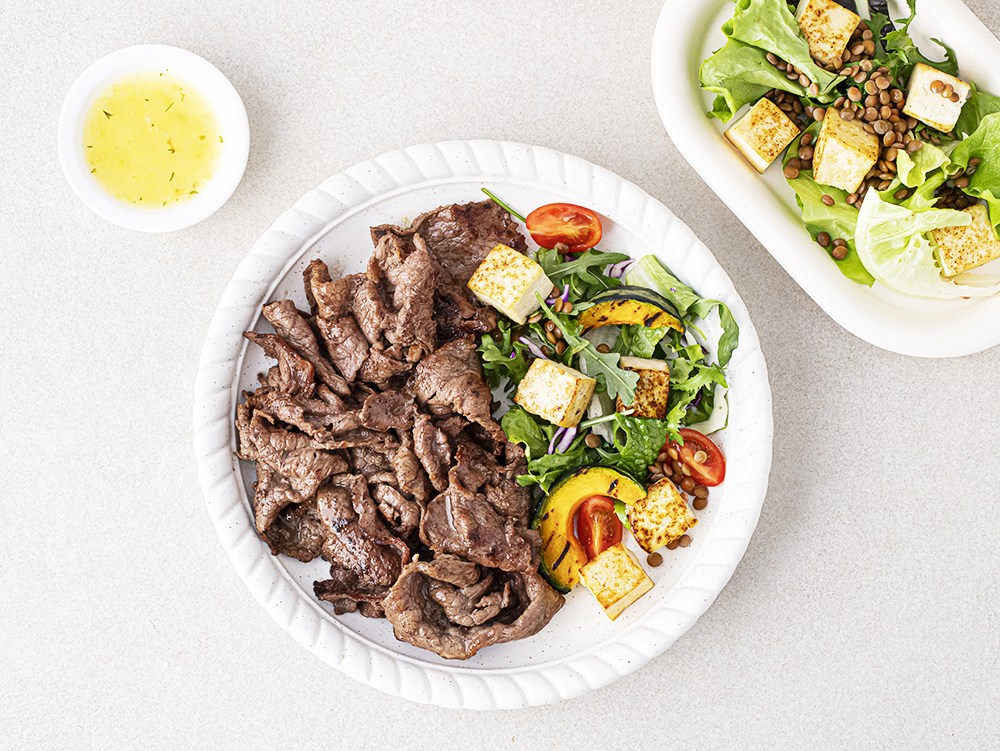 재료: 설도 150g, 샐러드 채소 1봉지(150g), 불린 병아리콩 1컵(140g), 두부 1/2모, 방울토마토 5개, 미니단호박 1/3개, 새송이버섯(미니)