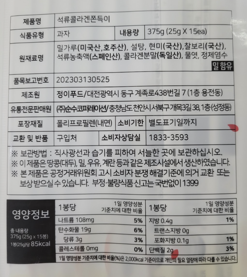 | 포장단위별 내용물의 용량(중량), 수량 | 컨텐츠 참조, 375g (25g X 15ea), 1개 | 원재료명 및 함량 | 컨텐츠 참조 |