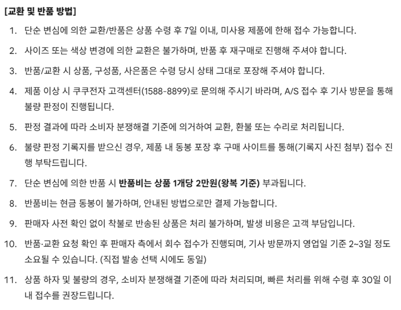 - ㆍ교환/반품에 관한 일반적인 사항은 판매자가 제시사항보다 관계법령이 우선합니다.