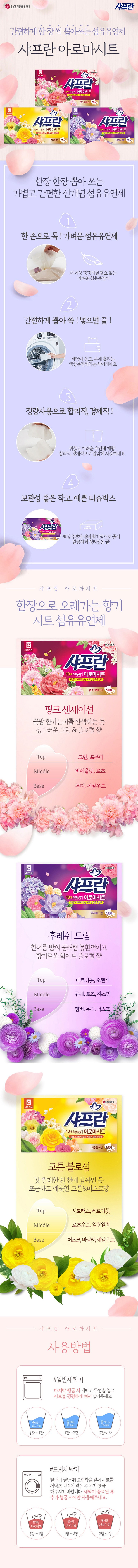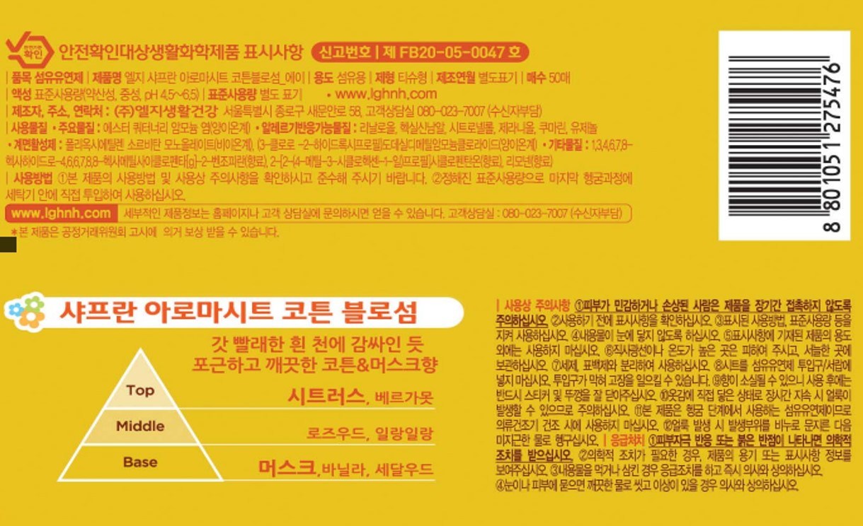 | 품목 및 제품명 | 섬유유연제 / 엘지 샤프란 아로마시트 코튼블로섬_에이 | 용도(표백제의 경우 계열을 함께표시) 및 제형 | 섬유용 / 티슈형 |