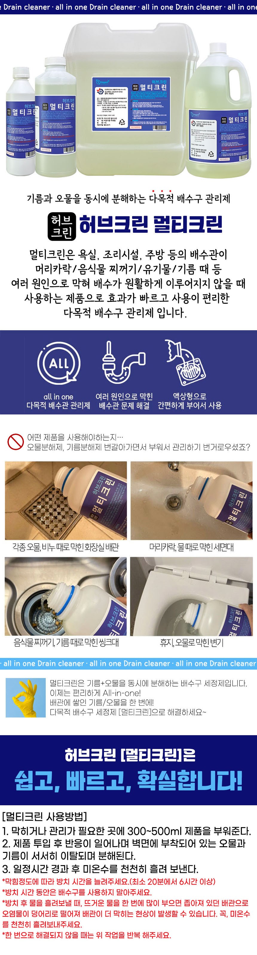 | 품목 및 제품명 | 세정제 / 허브크린 멀티크린 | 용도(표백제의 경우 계열을 함께표시) 및 제형 | 일반용(배수관용),일반용(변기용),일반용(기타표면세정용(배수구)) / 액체형 |