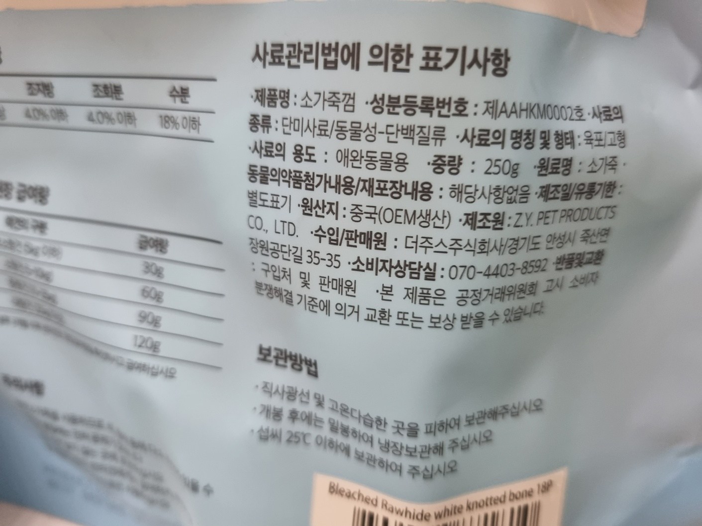 | 품명 및 모델명 | 소가죽껌 | 인증/허가 사항 | 사료관리법에 따른 성분등록번호 : 컨텐츠 참조 |