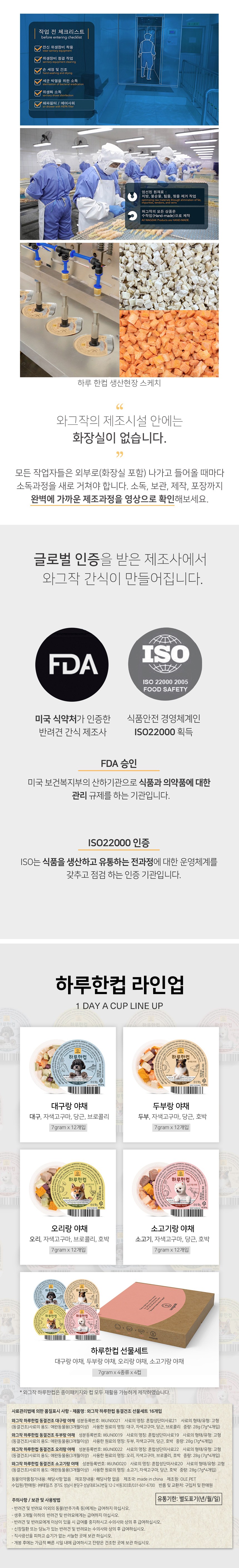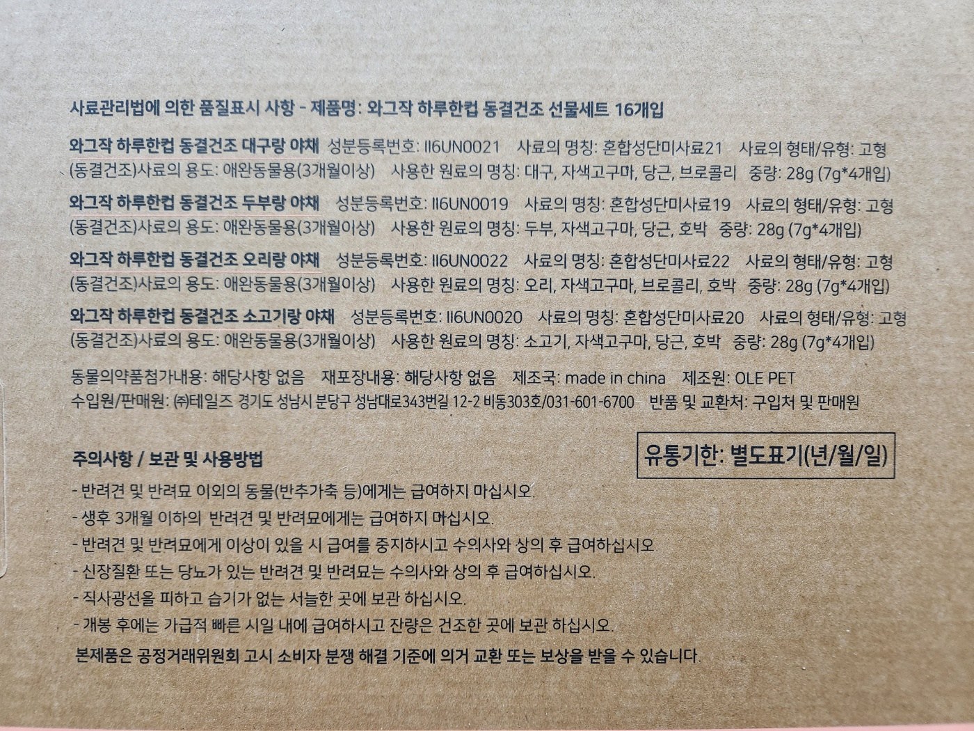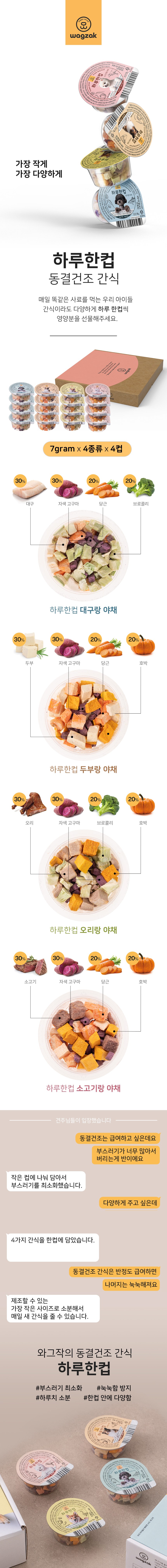 | 품명 및 모델명 | 와그작 하루한컵 동결건조 대구랑 야채 + 와그작 하루한컵 동결건조 두부랑 야채 + 와그작 하루한컵 동결건조 오리랑 야채 + 와그작 하루 한컵 동결건조 소고기랑 야채 | 인증/허가 사항 | 사료관리법에 따른 성분등록번호 : 컨텐츠 참조 |