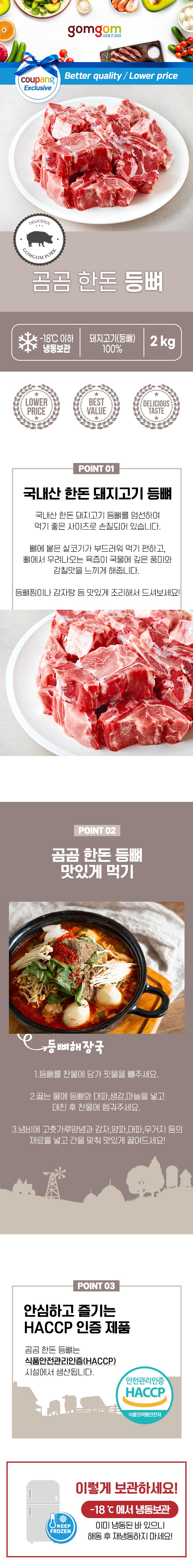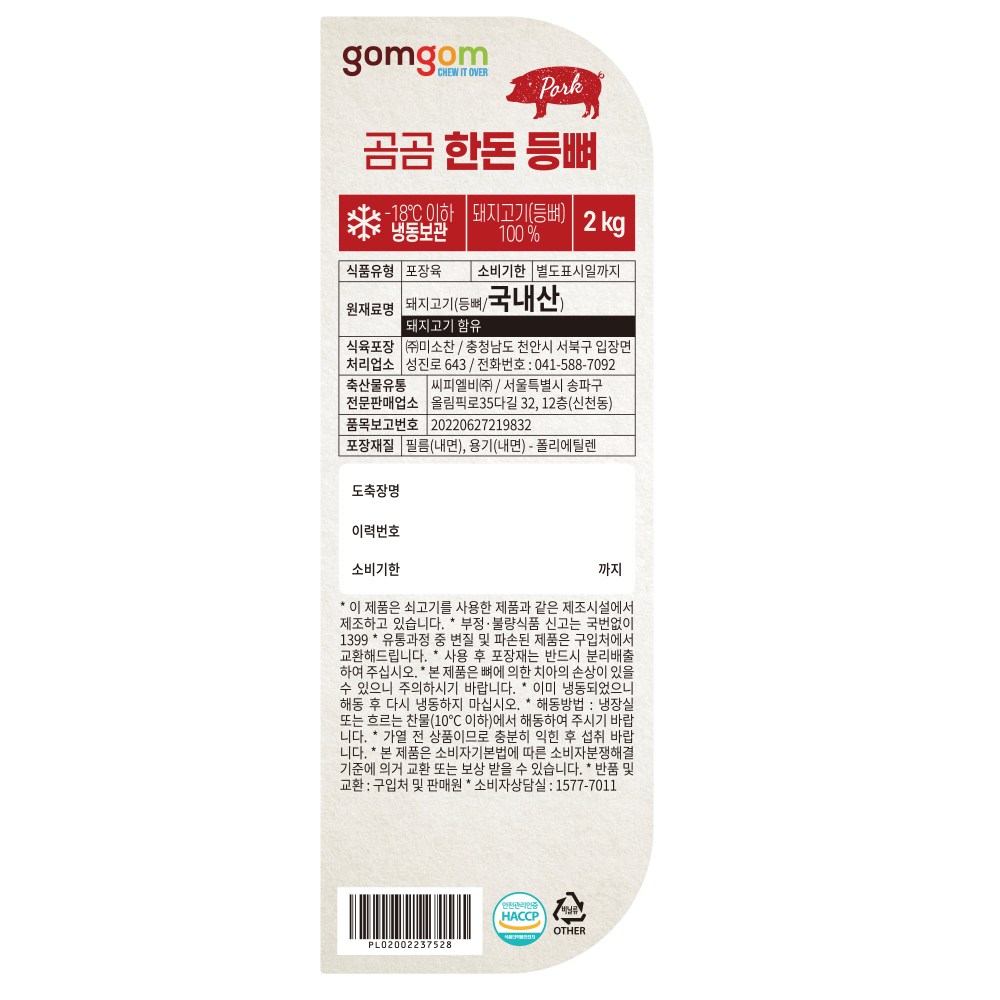 | 품목 또는 명칭 | 곰곰 한돈 등뼈 | 포장단위별 내용물의 용량(중량),수량,크기 | 2kg x 2개,1개 |