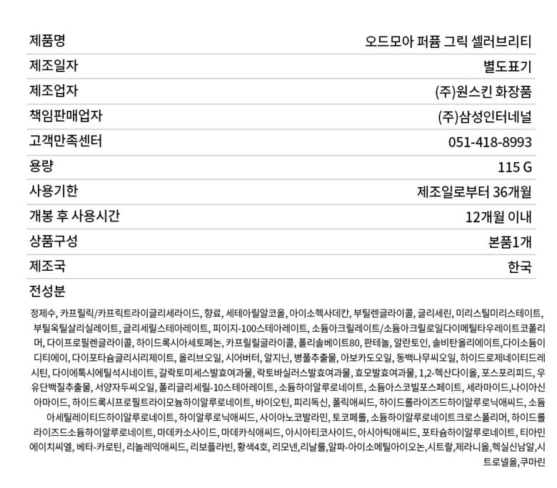 | 화장품제조업자, 화장품책임판매업자 및 맞춤형화장품판매업자 | 상품 상세페이지 참조 | 제조국 | 상품 상세페이지 참조 |