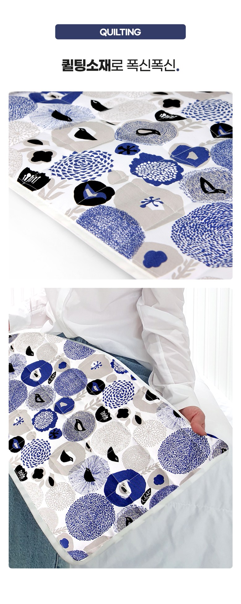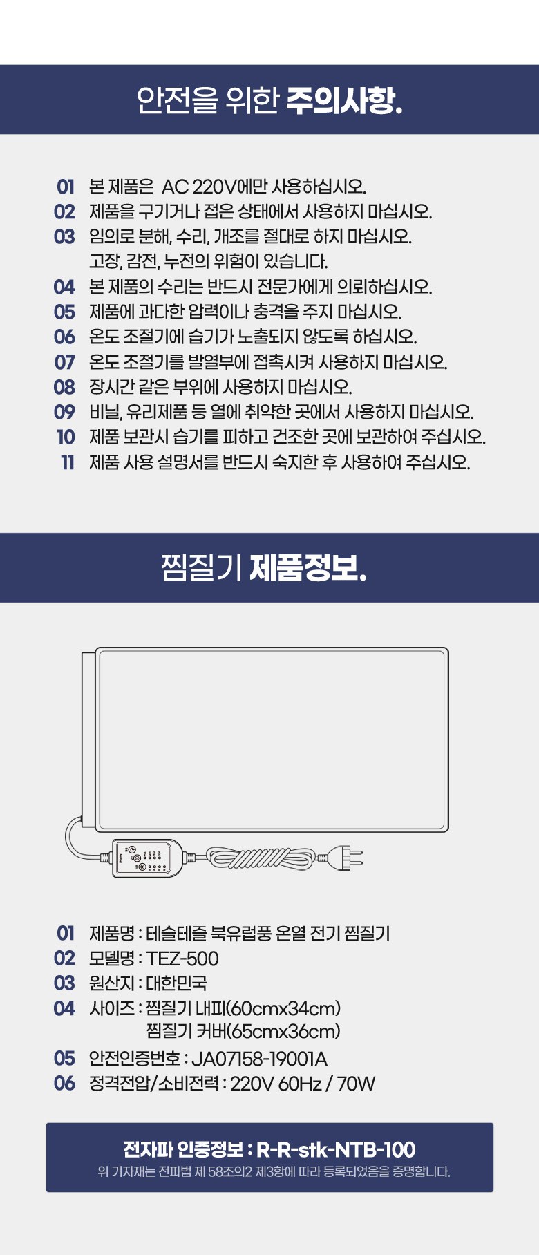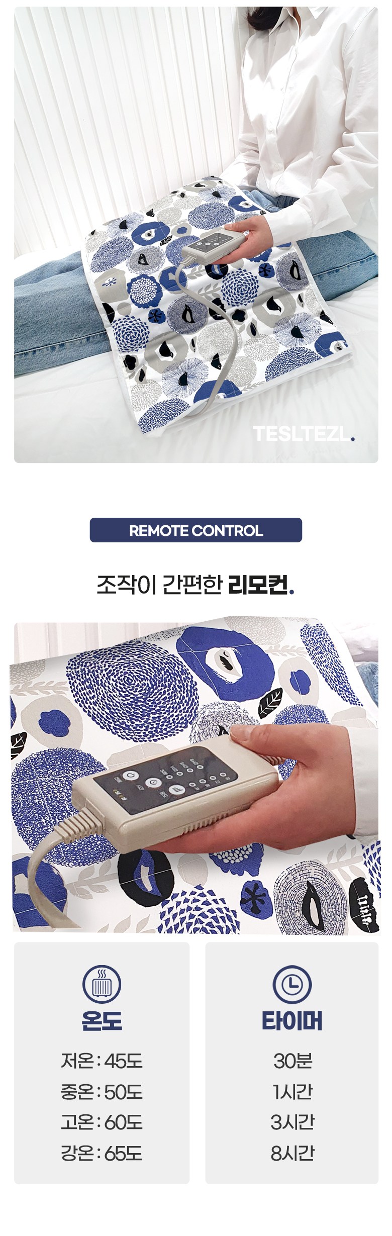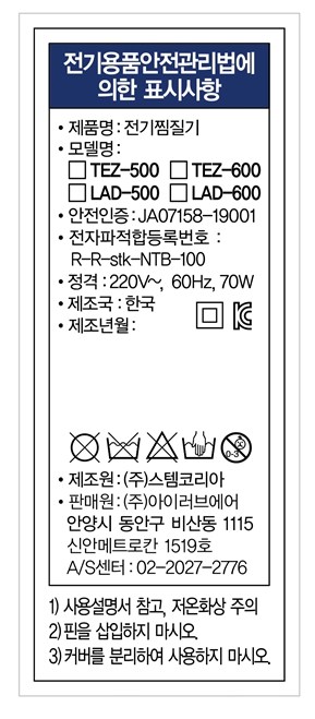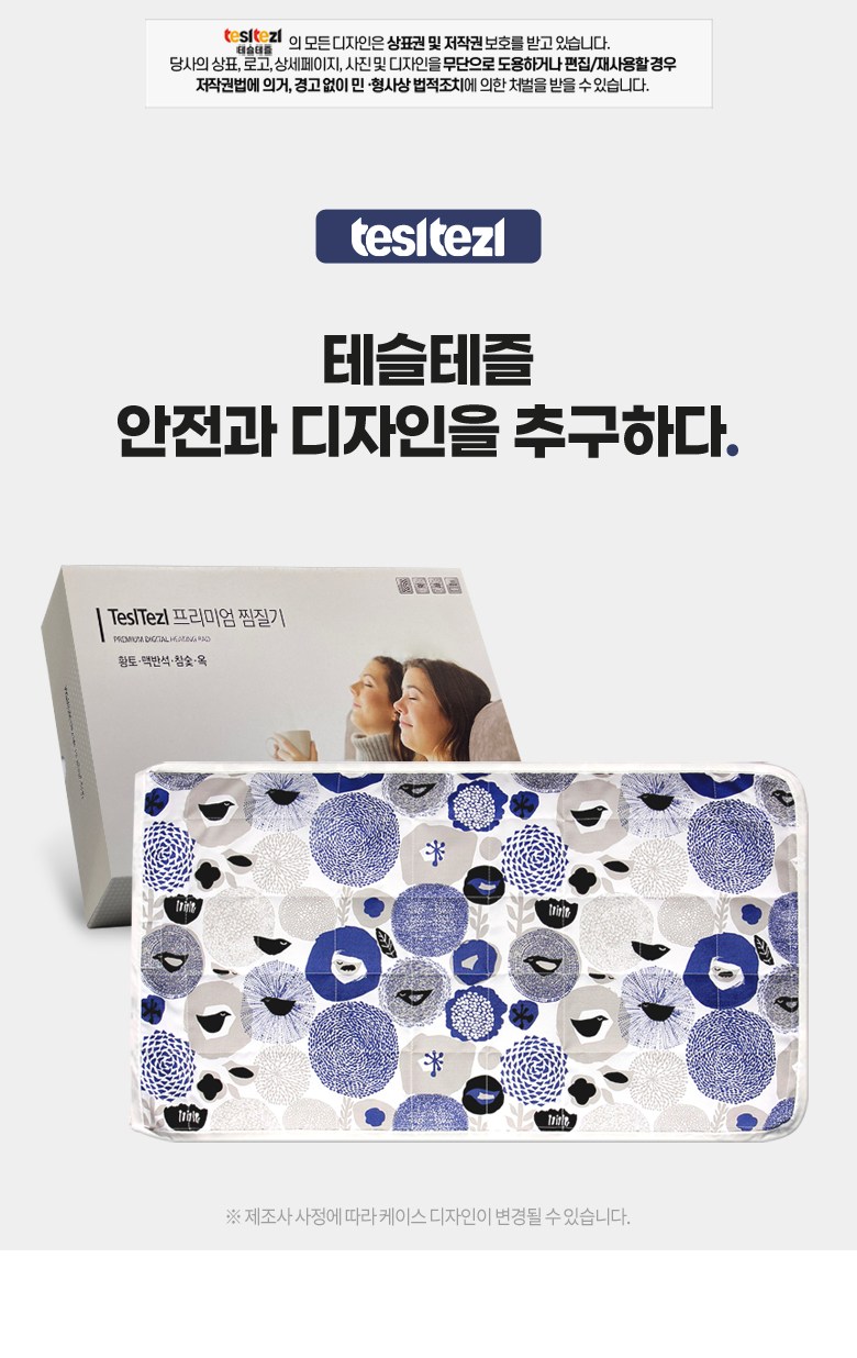 | 품명 및 모델명 | 테슬테즐 북유럽풍 온열 전기 찜질기 (블루블라썸 퀼팅) TEZ-500 | KC 인증정보 | JA07158-19001A, R-R-stk-NTB-100 |
