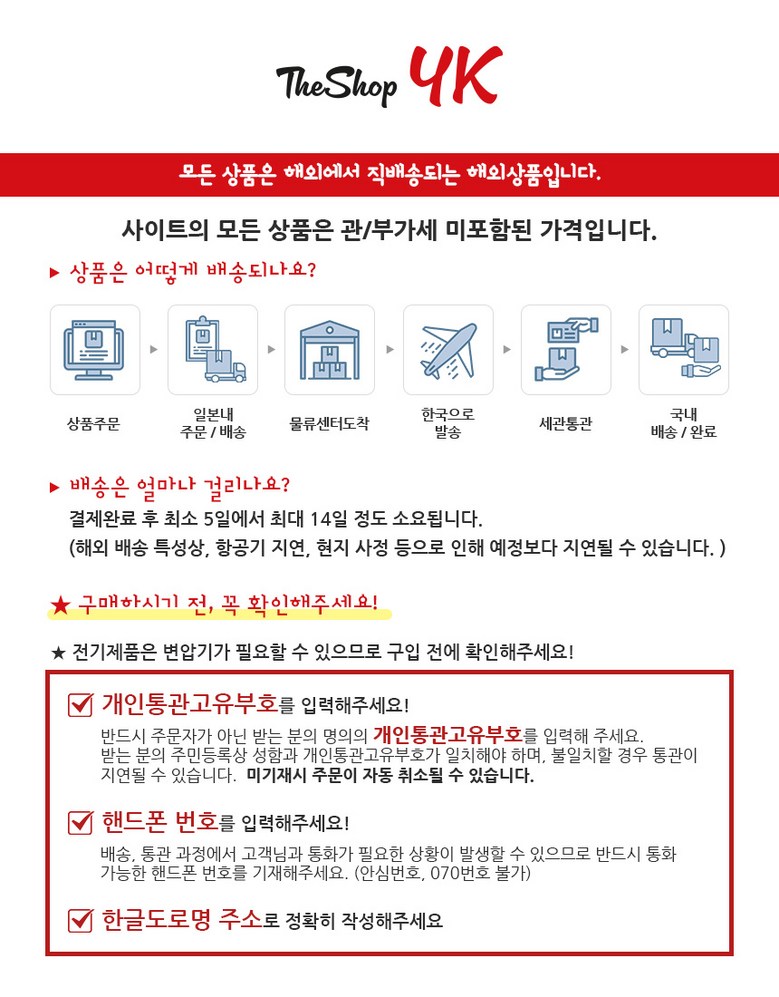 | 배송방법 | 해외직구 | 배송비 | 무료배송 - 도서산간 지역 배송불가 |