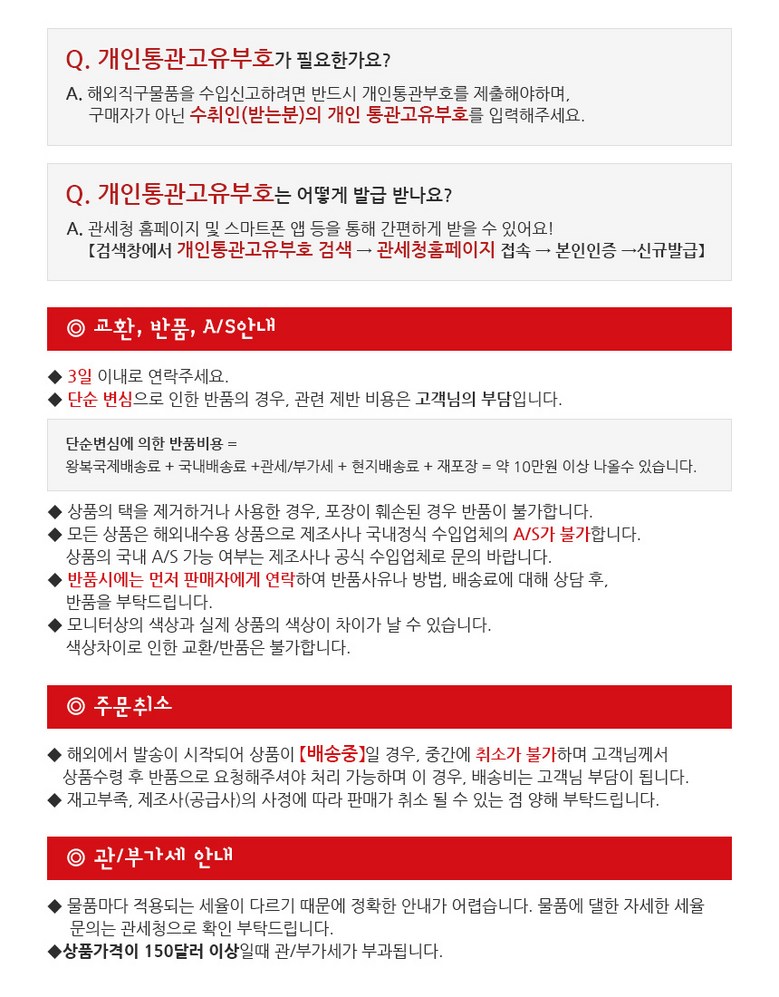 - 주문일 기준 동일 판매자 총 구매 금액이 면세 한도 초과 시 관부가세가 부과될 수 있습니다.
