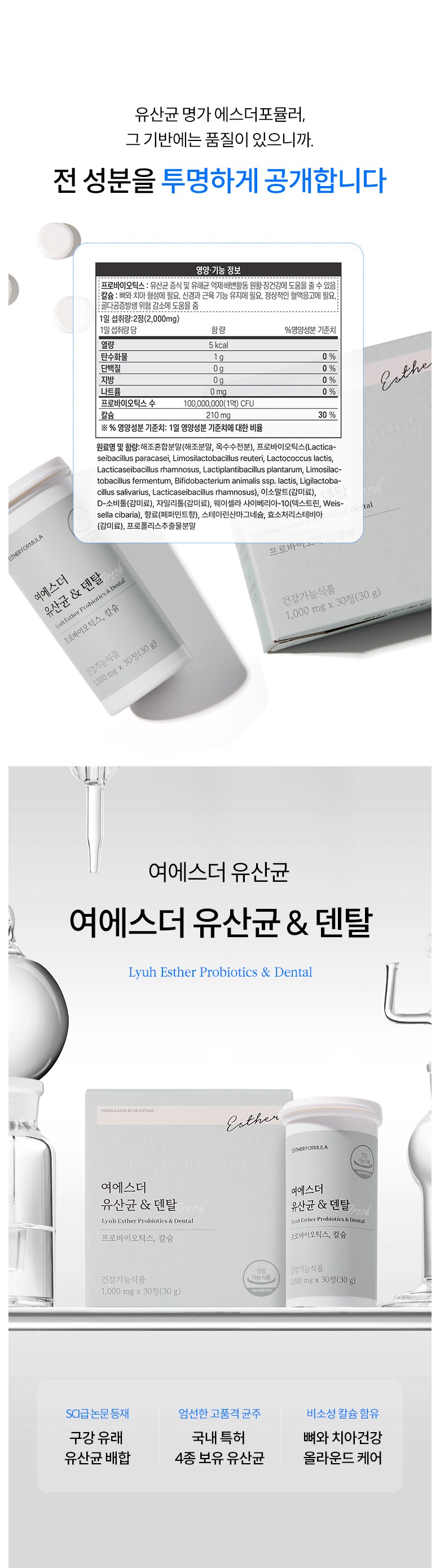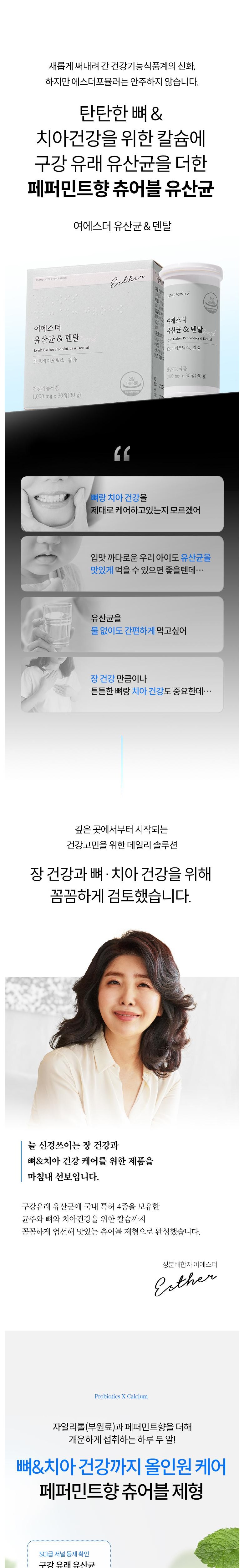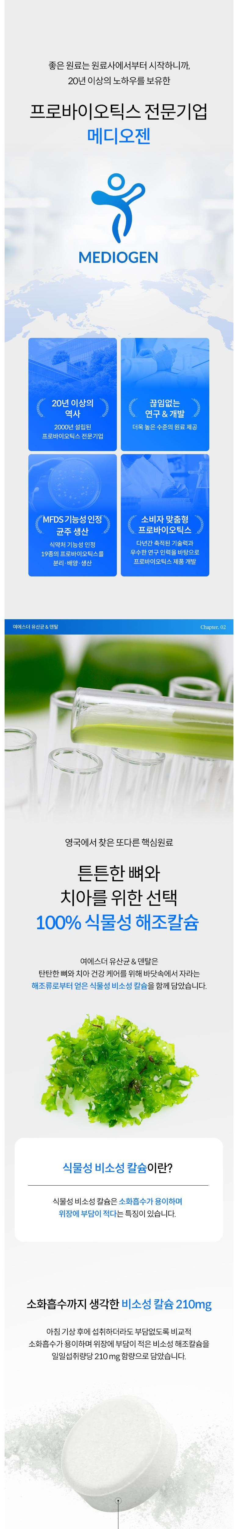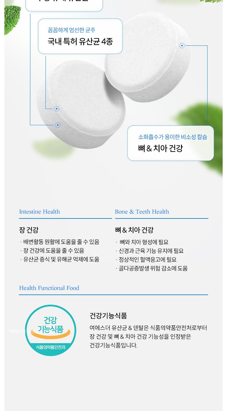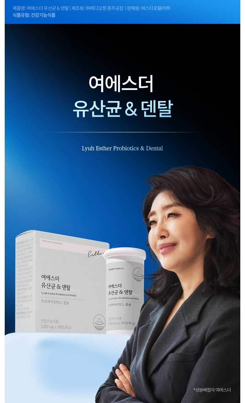 | 제품명 | 여에스더 유산균 & 덴탈 (건강기능식품에 관한 법률에 따른 심의 필함 / 251210670_250110598) | 제조업소의 명칭과 소재지 | (주)메디오젠 충주공장 / 충청북도 충주시 대소원면 메가폴리스 3로 17 |