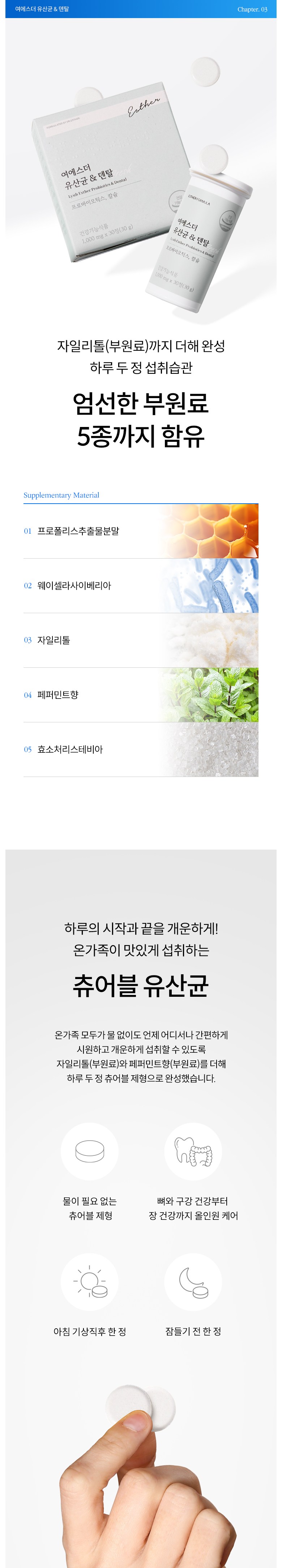 | 원료명 및 함량 | 해조혼합분말(해조분말, 옥수수전분), 프로바이오틱스(Lacticaseibacillus paracasei, Limosilactobacillus reuteri, Lactococcus lactis, Lacticaseibacillus rhamnosus, Lactiplantibacillus plantarum, Limosilactobacillus fermentum, Bifidobacterium animalis ssp. lactis, Ligilactobacillus salivarius, Lacticaseibacillus rhamnosus), 이소말트, D-소비톨, 자일리톨, 웨이셀라사이베리아-10(덱스트린, Weissella cibaria), 향료(페퍼민트향), 스테아린산마그네슘, 효소처리스테비아, 프로폴리스추출물분말 *알레르기주의 물질: 우유, 대두 함유 | 영양정보 | 상품 상세페이지 참조 |