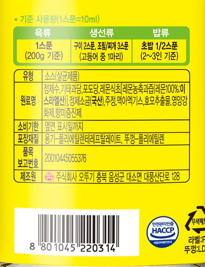 | 제품명 | 오뚜기 미향 | 식품의 유형 | 소스(살균제품) |