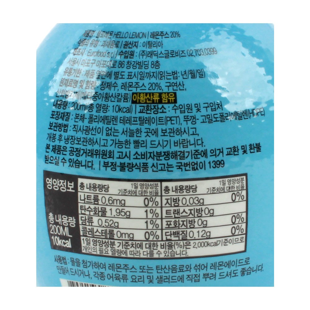 | 제품명 | 헬로레몬 | 식품의 유형 | 과채음료 |