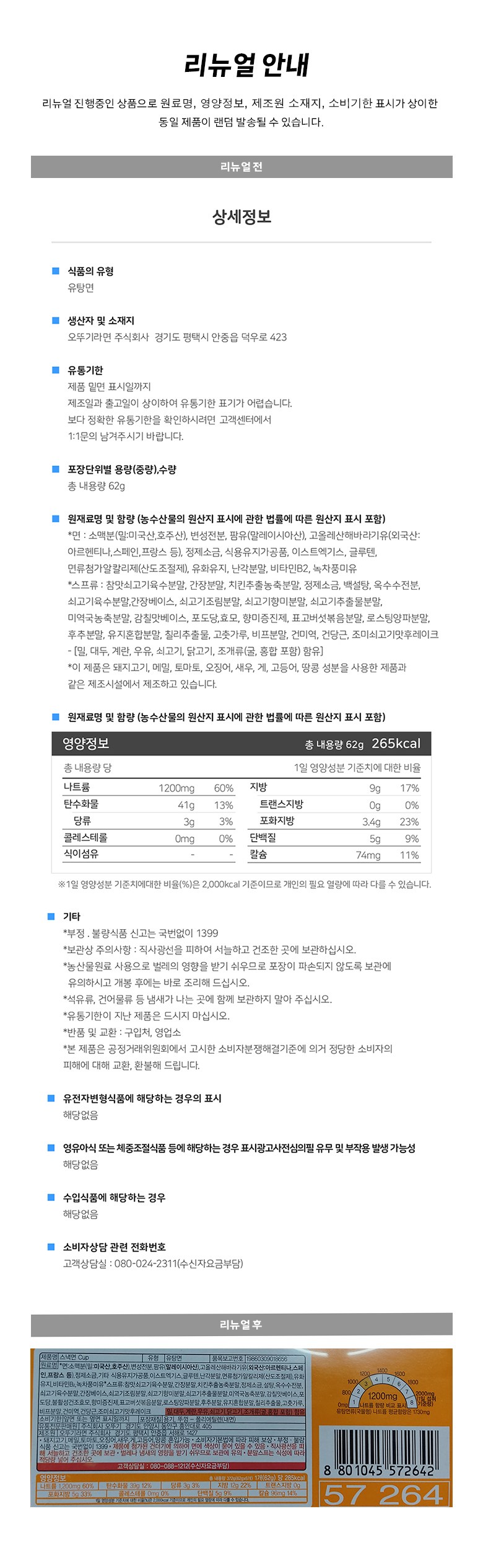 | 제품명 | 스낵면 컵라면 | 식품의 유형 | 유탕면 |