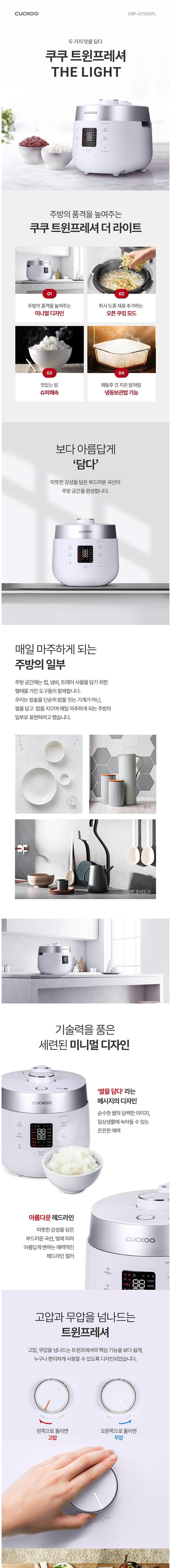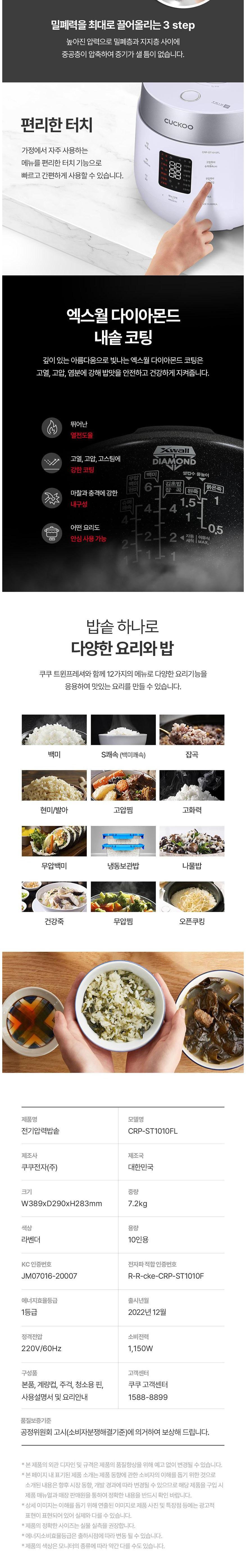 | 품명 및 모델명 | 쿠쿠 트윈프레셔 더라이트 전기압력밥솥 10인용(전기보온밥솥) , CRP-ST1010FL | KC 인증정보 | JM07016-20007C , R-R-cke-CRP-ST1010F |