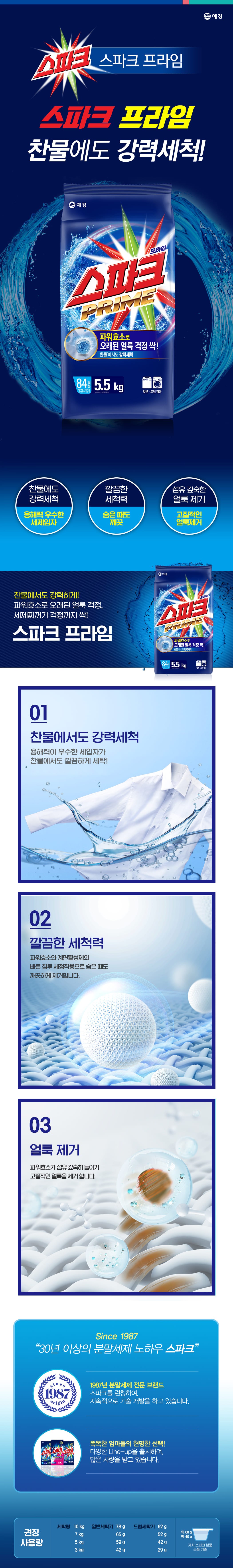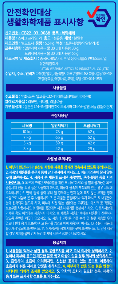 | 품목 및 제품명 | 세탁세제 / 스파크 프라임_리 | 용도(표백제의 경우 계열을 함께표시) 및 제형 | 섬유용 / 분말형 |
