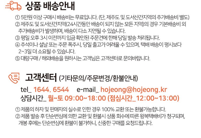 - ㆍ모니터 해상도의 차이로 인해 색상이나 이미지가 실제와 달라, 고객이 단순 변심으로 교환/반품을 무료로 요청하는 경우