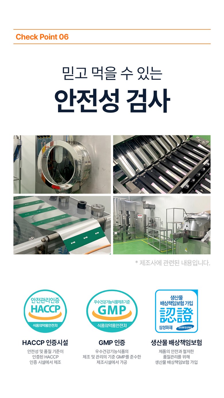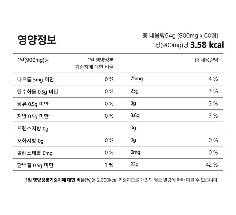 | 제조연월일, 유통기한 또는 품질유지기한 | 상품 상세페이지 참조 | 포장단위별 용량(중량), 수량 | 900mg x 60정 (54g, 190kcal) |