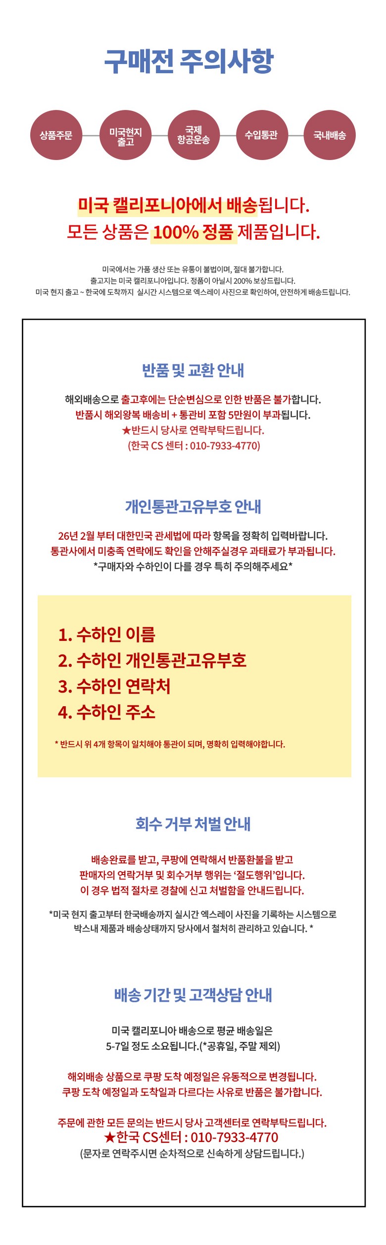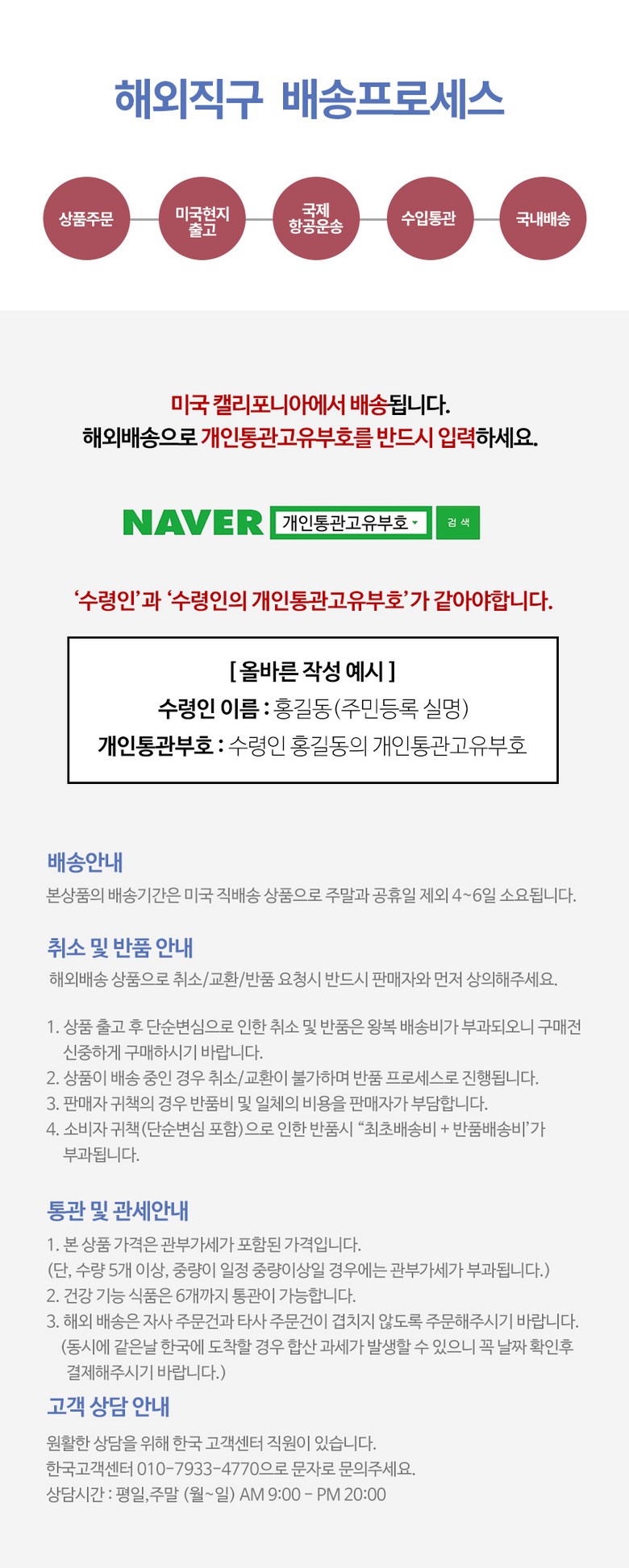 - 법규 개정에 따라 개인통관고유부호 검증 절차가 강화되었습니다. 결제 단계에서 받는 사람의 정보가 관세청 등록 정보 (성명, 휴대폰, 개인통관고유부호, 주소) 와 일치하는지 확인해주세요.