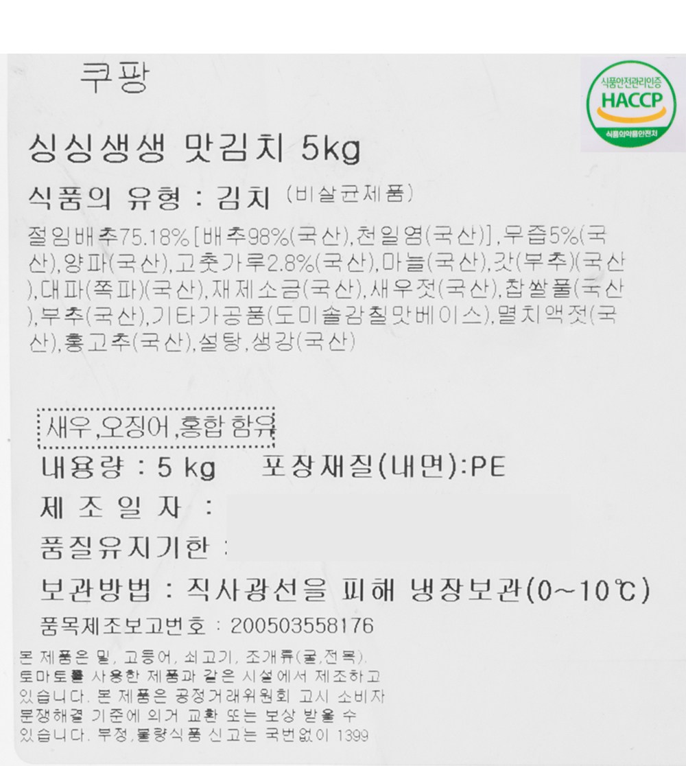 | 제품명 | 싱싱생생맛김치 | 식품의 유형 | 컨텐츠 참조 |