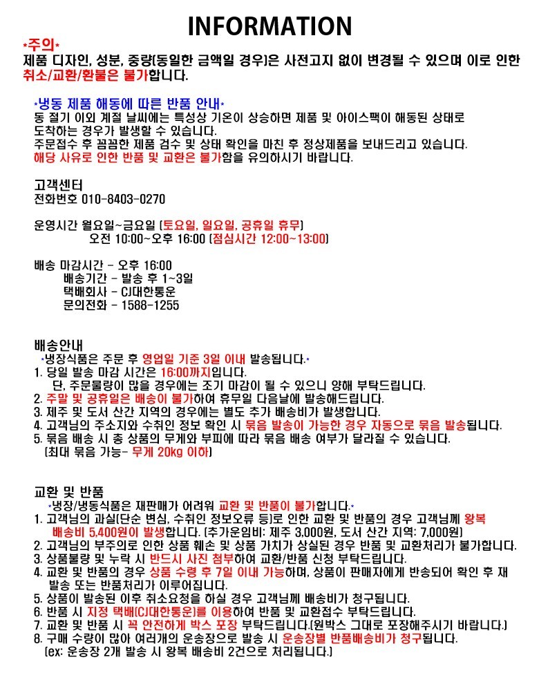| 배송방법 | 신선/냉장/냉동 | 배송비 | 무료배송 - 도서산간 지역 배송불가 |
