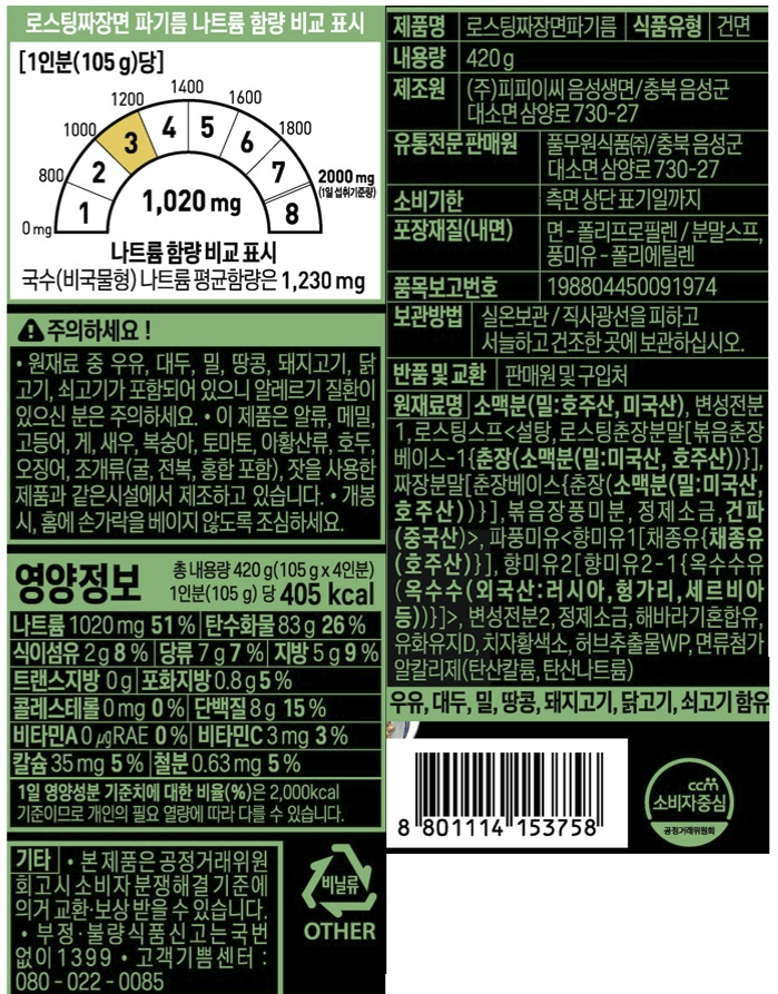 | 포장단위별 내용물의 용량(중량), 수량 | 105g x 4개입 x 4개 | 원재료명 및 함량 | 컨텐츠 참조 |