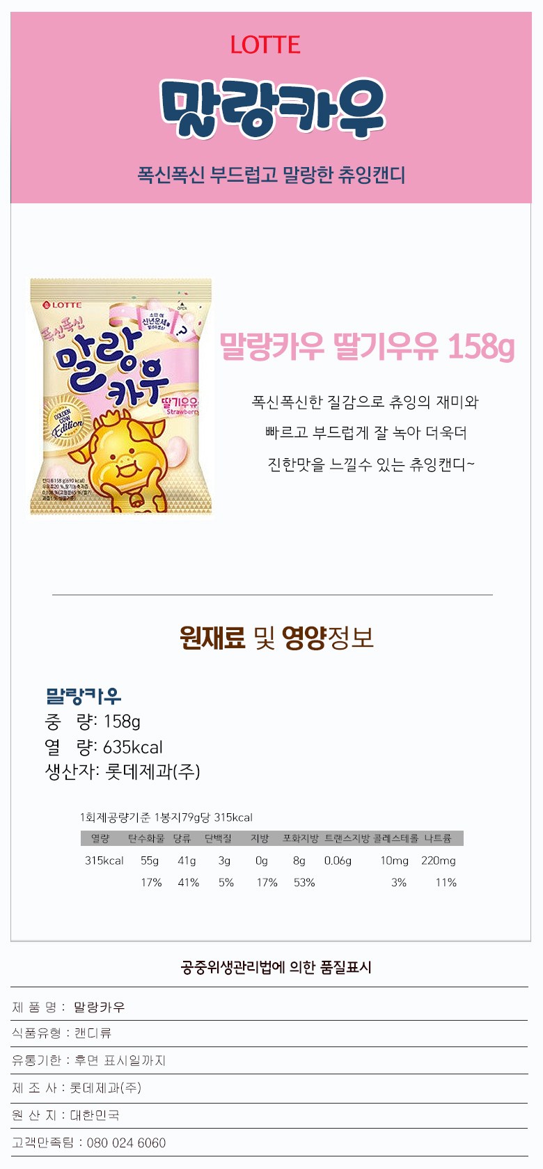 롯데 폭신폭신 말랑카우 딸기우유맛 158g 식품 > 스낵/간식 초콜릿/사탕/젤리/껌 캔디류 일반하드캔디, 158g, 1개