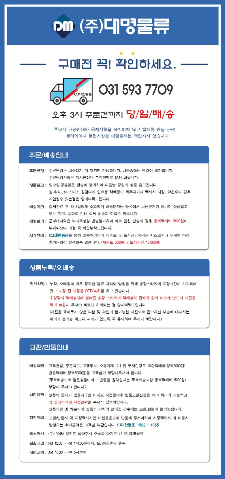 - ㆍ교환/반품에 관한 일반적인 사항은 판매자가 제시사항보다 관계법령이 우선합니다.