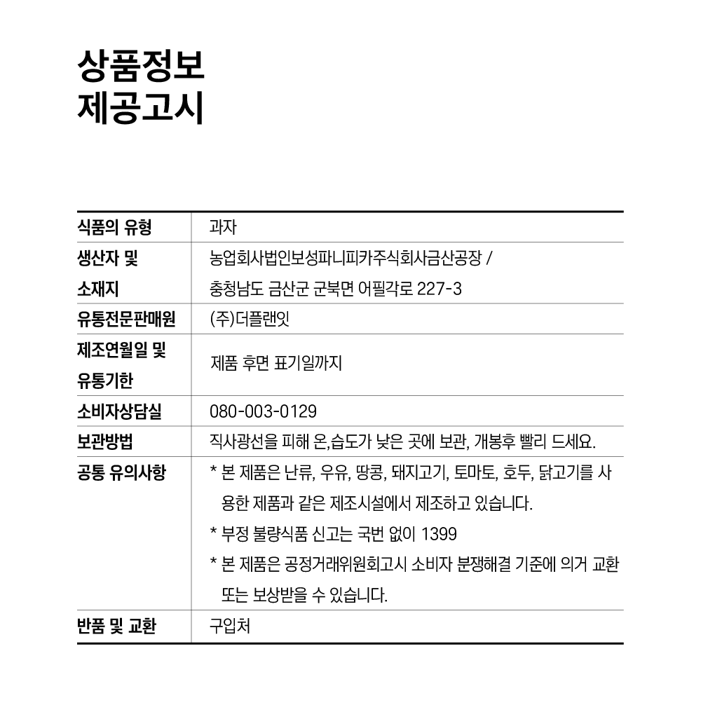 | 생산자 및 소재지 | 컨텐츠참조 | 제조연월일, 소비기한 또는 품질유지기한 | 소비기한(또는 유통기한) : 2026년 05월 01일 이거나 그 이후인 상품<br />제조년월일 : 2025년 05월 02일 이후인 제조상품 |