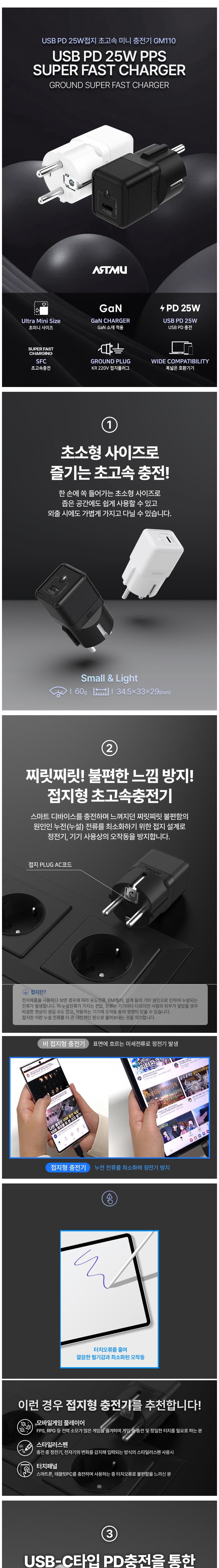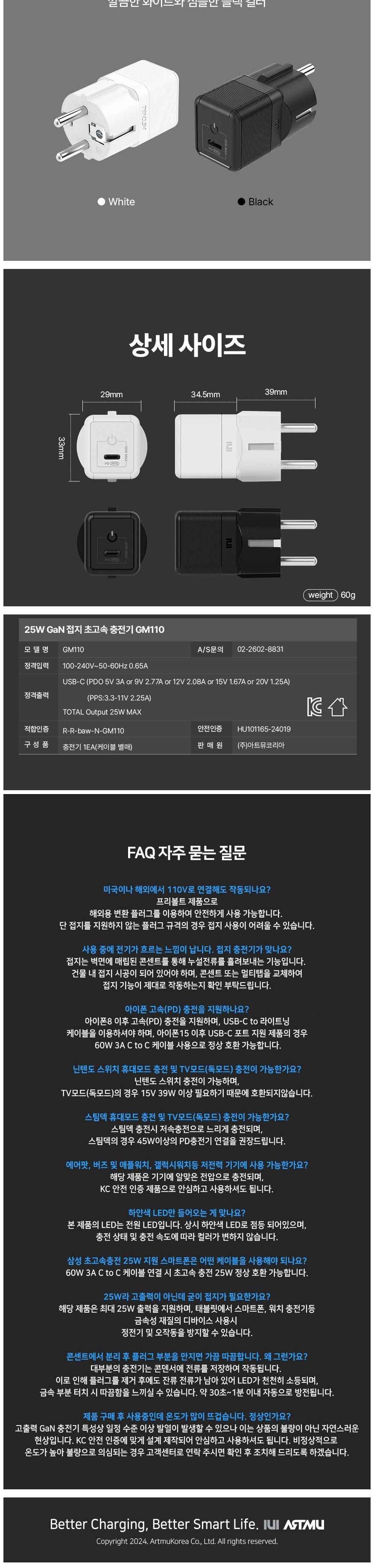 | 품명 및 모델명 | 아트뮤 USB PD 25W PPS GaN 접지 초고속 미니 충전기 / GM110 | KC 인증정보 | HU101165-24019 , R-R-baw-N-GM110 |