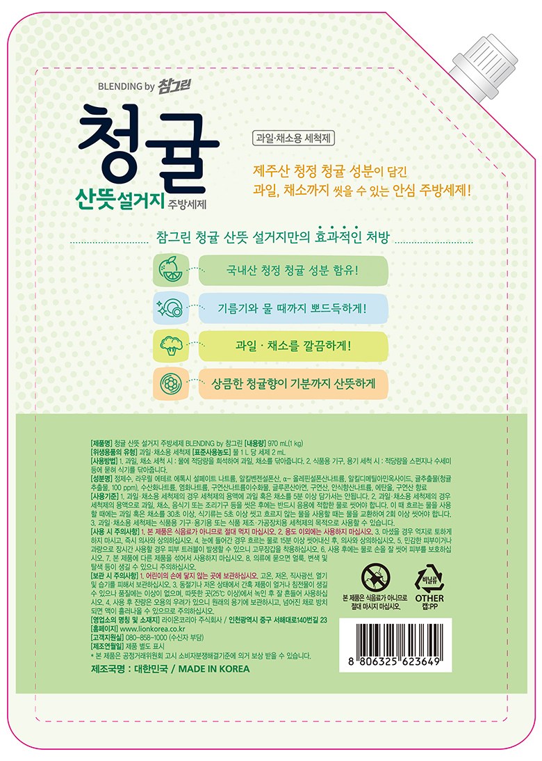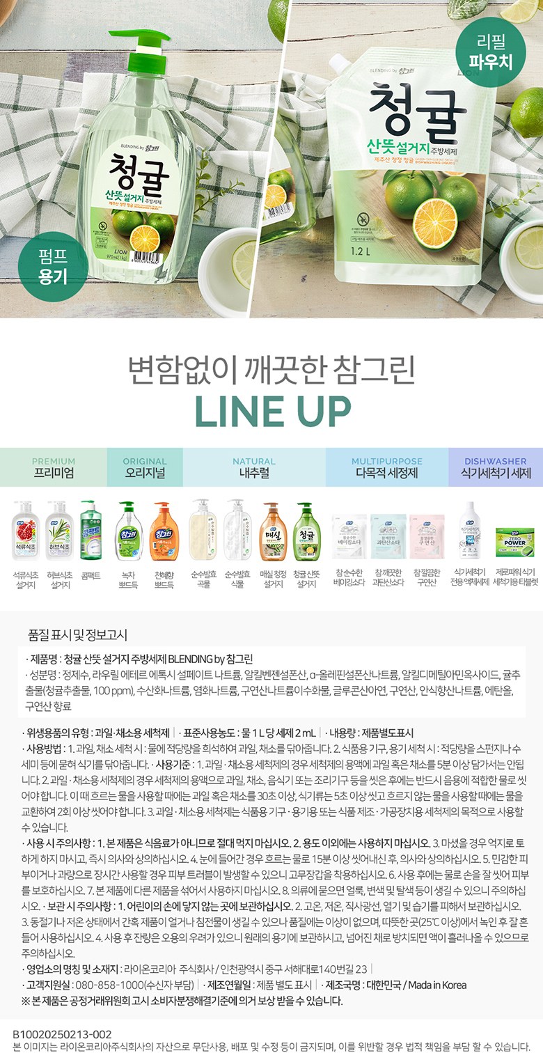 | 품명 및 모델명 | 청귤 산뜻 설거지 BLENDING by 참그린 | 인증/허가 사항 | 위생용품 |