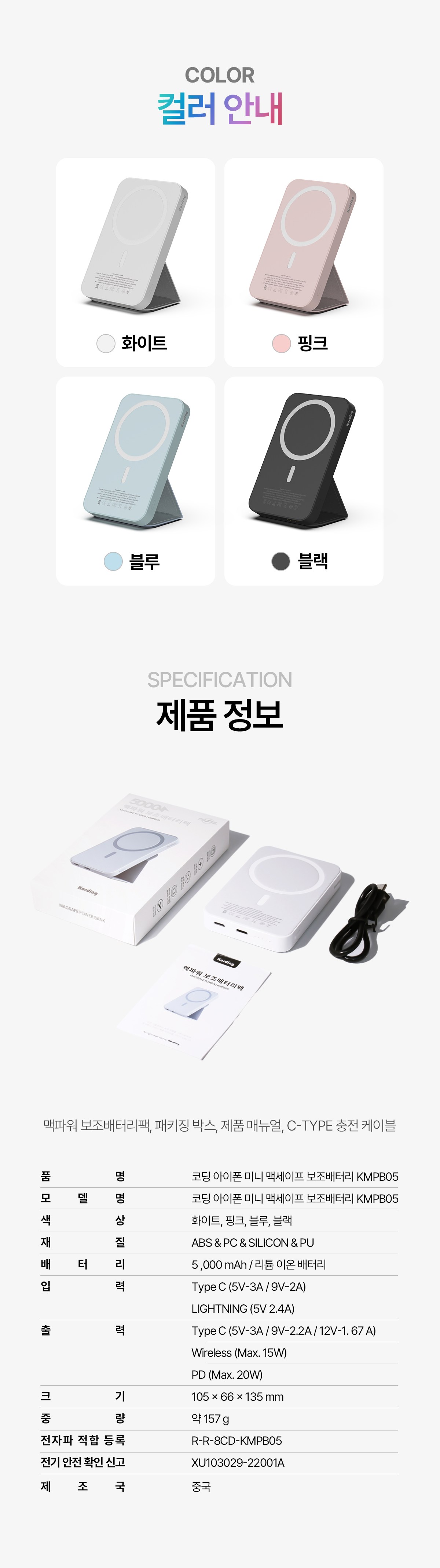 | 품명 및 모델명 | 보조배터리 / KMPB05 | KC 인증정보 | XU103029-22001A, R-R-8CD-KMPB05 |