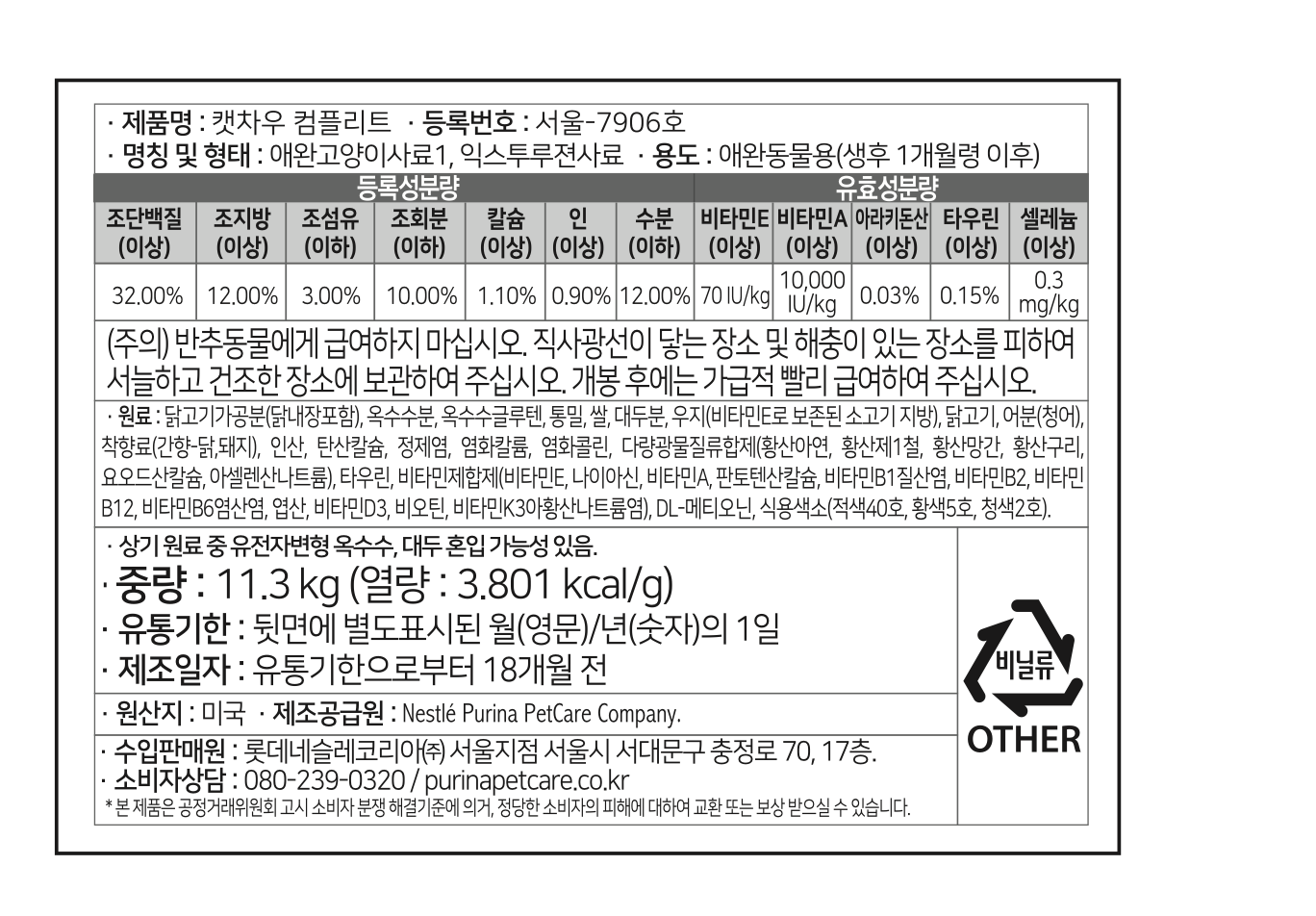 | 품명 및 모델명 | 캣 차우 컴플리트 | 인증/허가 사항 | 사료관리법에 따른 성분등록번호 : 컨텐츠 참조 |