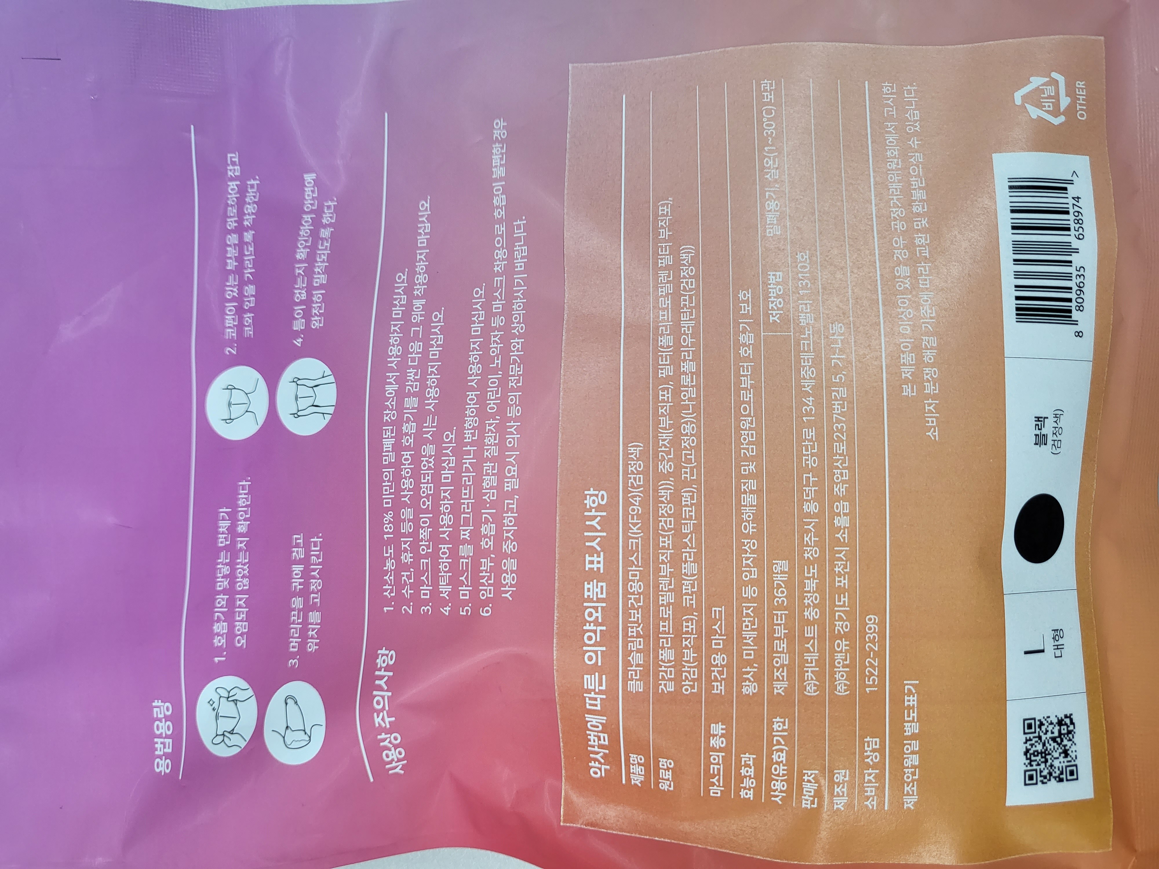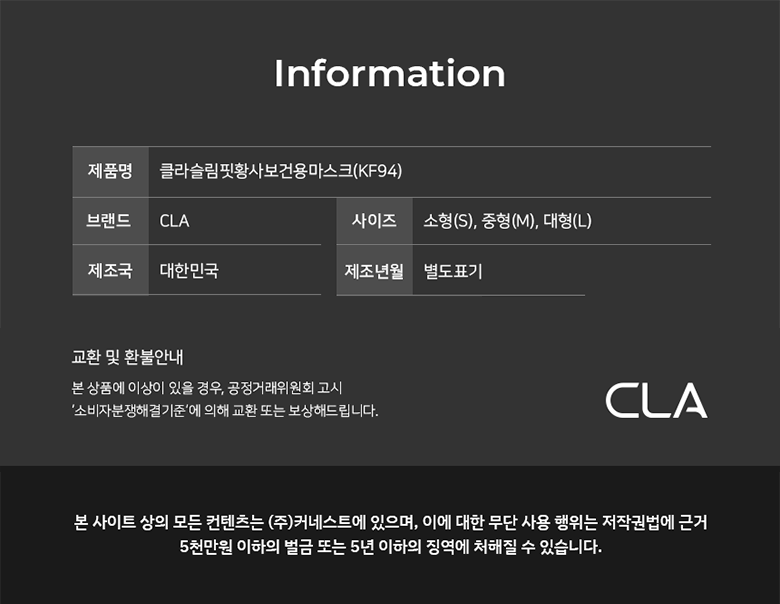 | 품명 및 모델명 | 클라슬림핏보건용마스크(KF94)(검정색)(대형) | 인증/허가 사항 | 의약외품 |