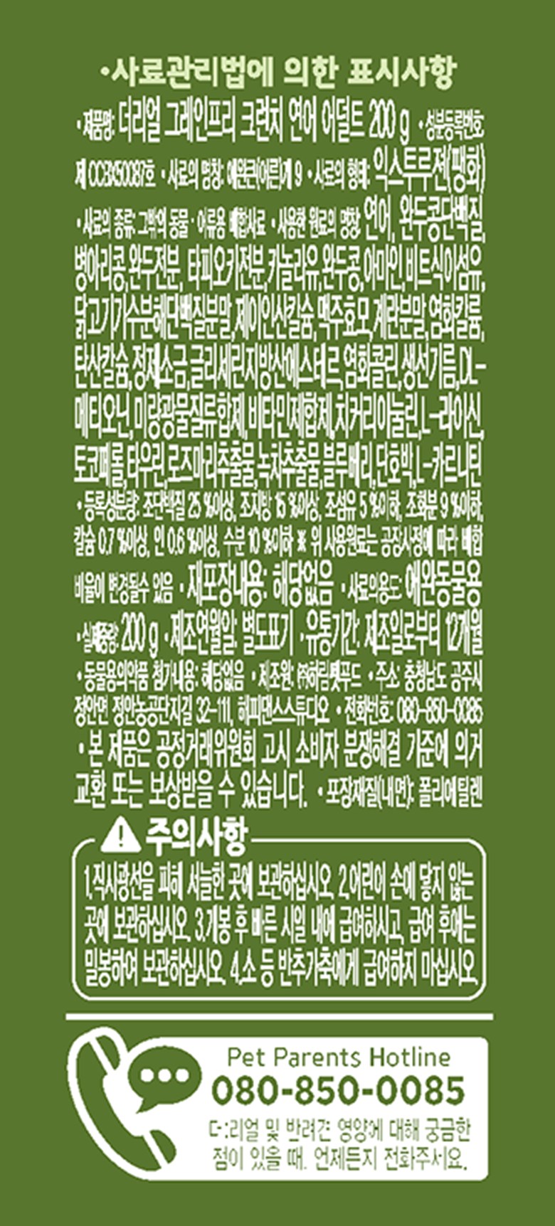 | 품명 및 모델명 | 더리얼 그레인프리 크런치 연어 어덜트 200g | 인증사항 | 해당없음 |