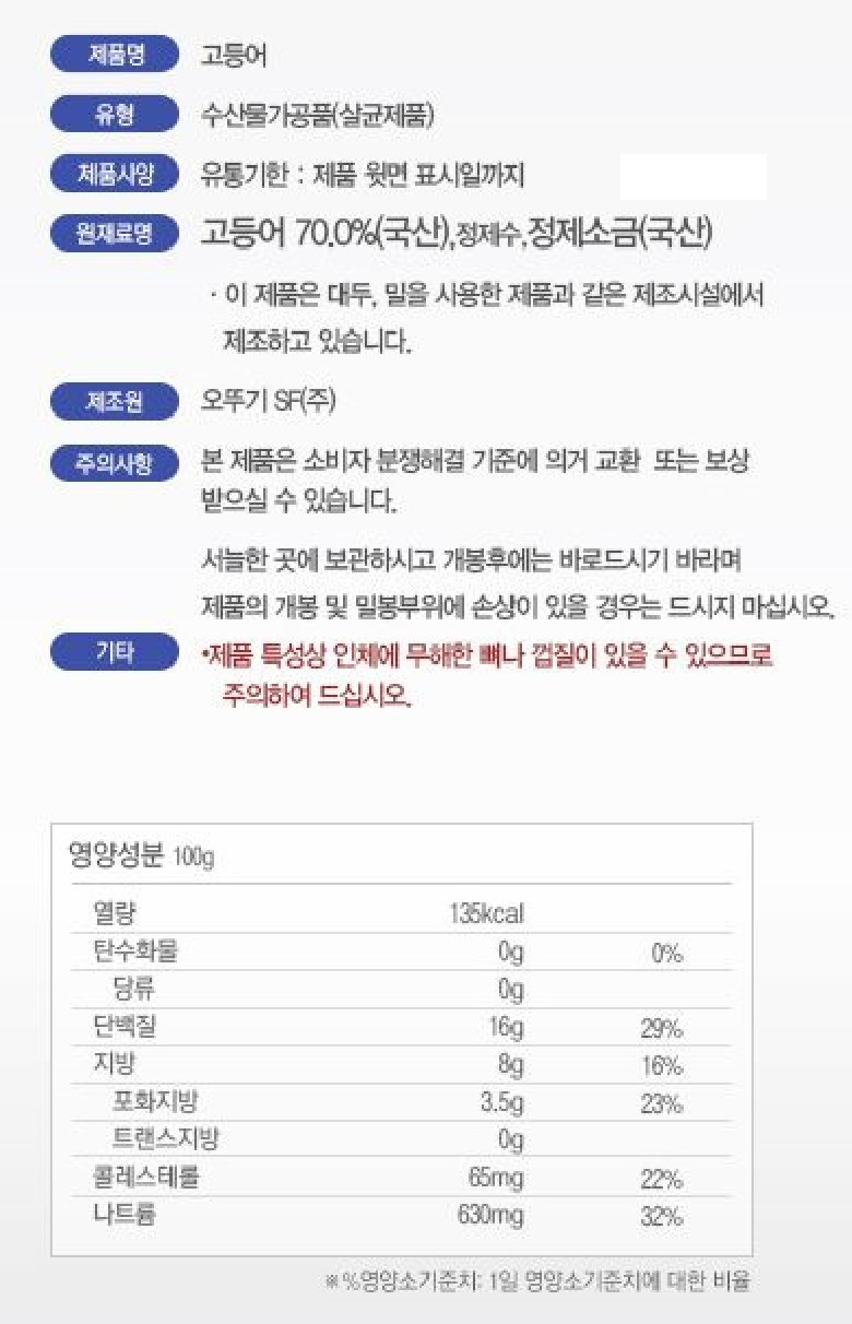 | 제품명 | 고등어 | 식품의 유형 | 수산물가공품(살균제품) |
