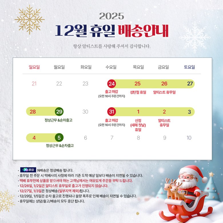 | 배송기간 | ㆍ도서산간 지역 등은 배송에 3-5일이 더 소요될 수 있습니다. - 천재지변, 물량 수급 변동 등 예외적인 사유 발생 시, 다소 지연될 수 있는 점 양해 부탁드립니다. | ||